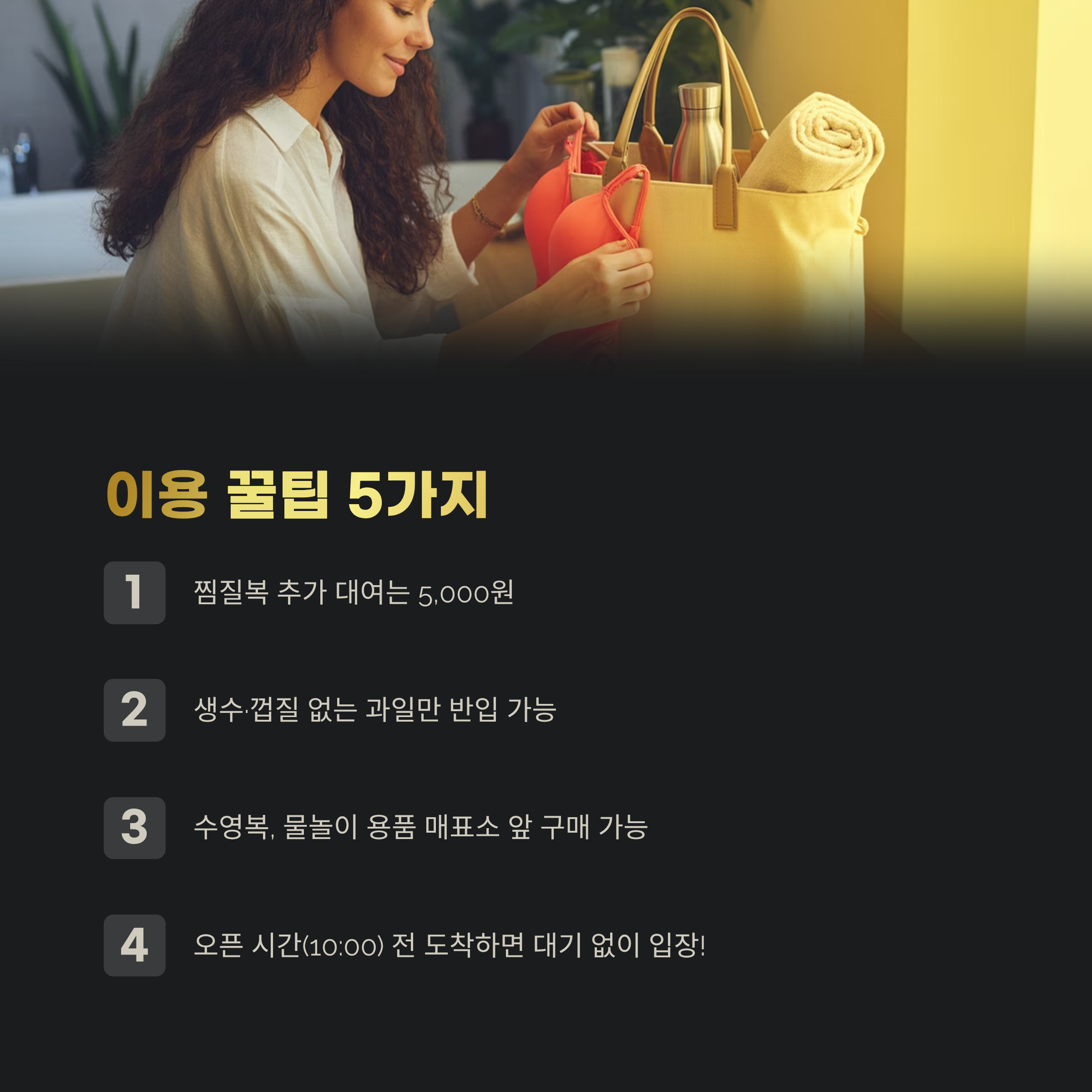 - 수영복, 물놀이 용품 등 매표소 앞 구매 가능