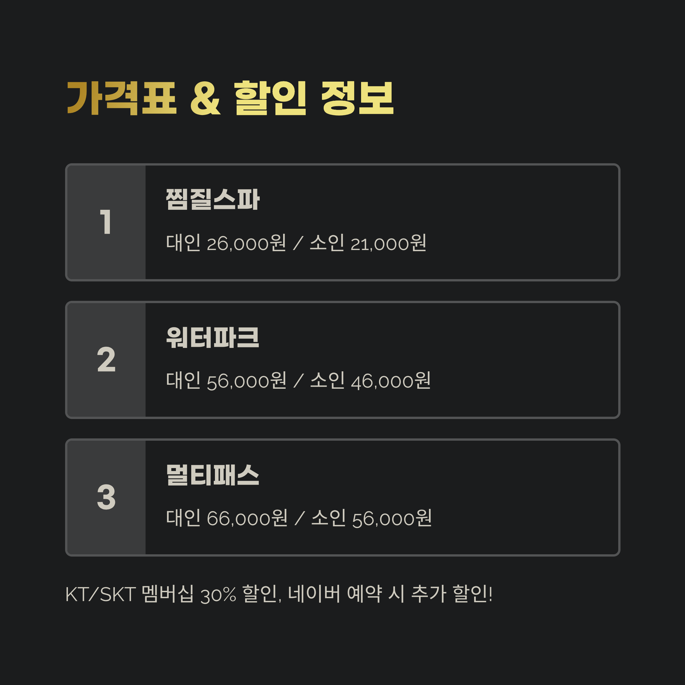 | 찜질스파 | 26,000원 | 21,000원 | KT/SKT 멤버십 30% 할인 가능 |