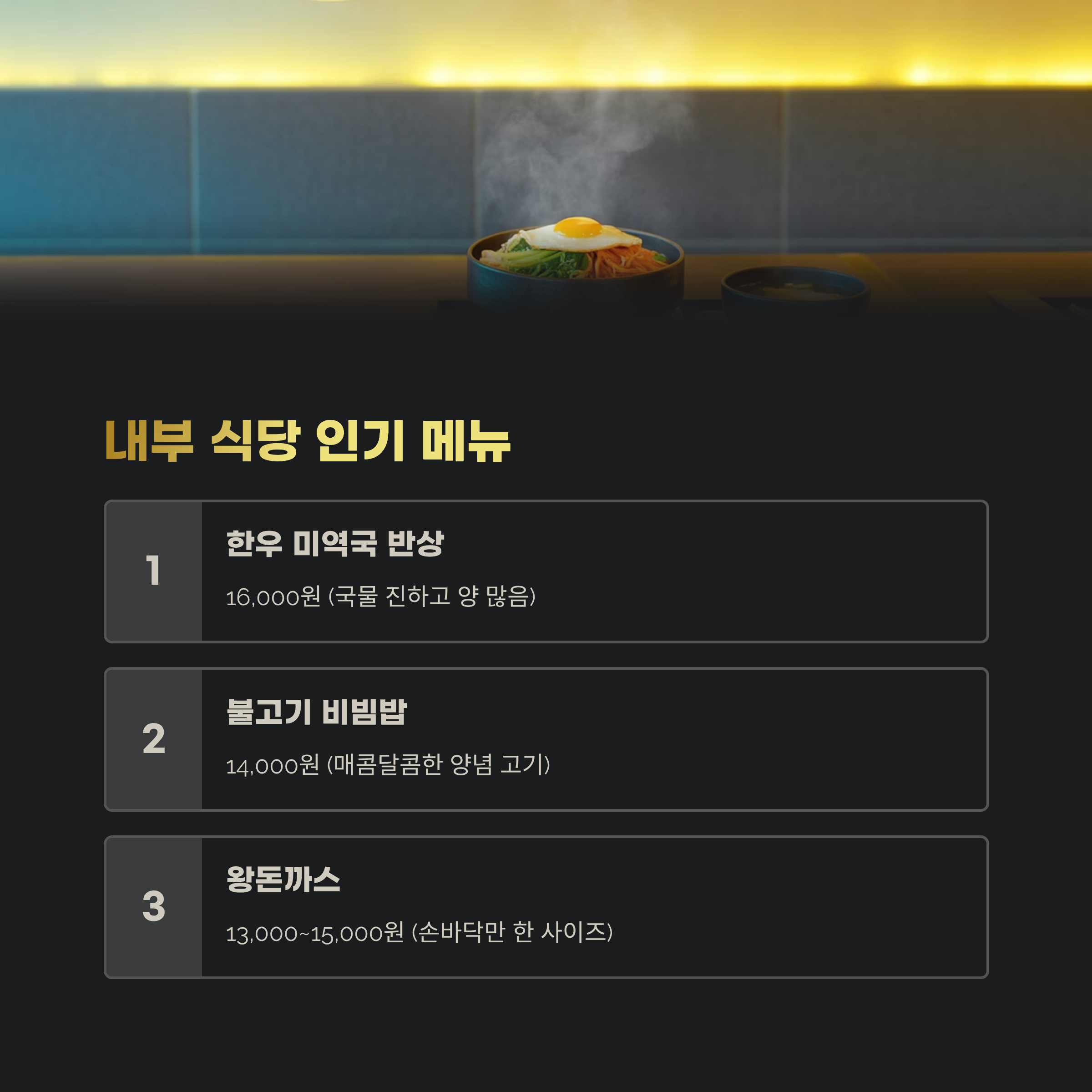 | 불고기 비빔밥 | 14,000원 | 매콤달콤한 양념 고기 |