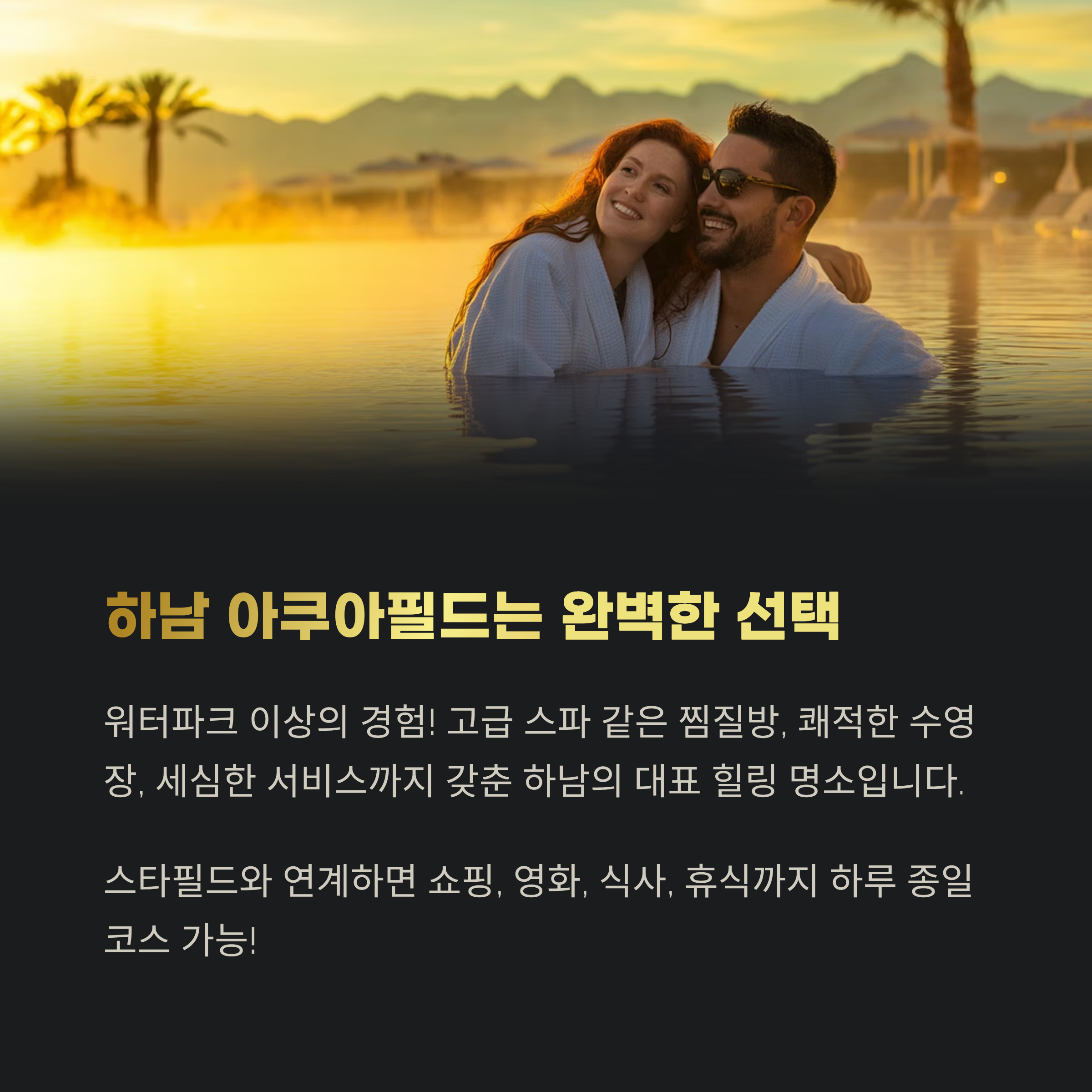 아쿠아필드는 워터파크 이상의 경험을 제공합니다. 고급 스파 같은 찜질방, 쾌적한 실내외 수영장, 세심한 고객 서비스까지.