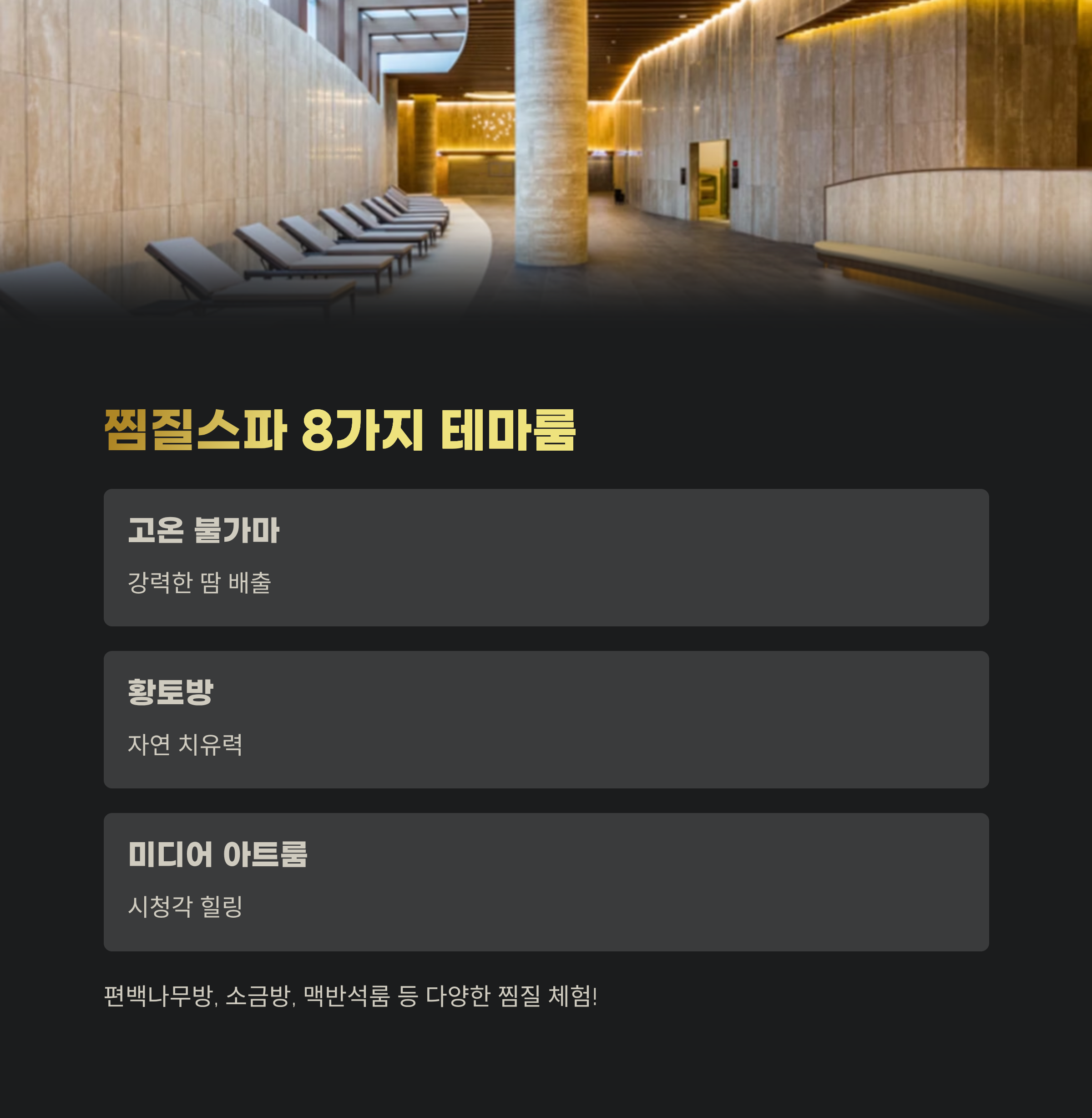 총 8가지 테마 찜질룸이 있고, 각기 다른 온도와 소재로 구성되어 있어 다양한 찜질 체험이 가능합니다.