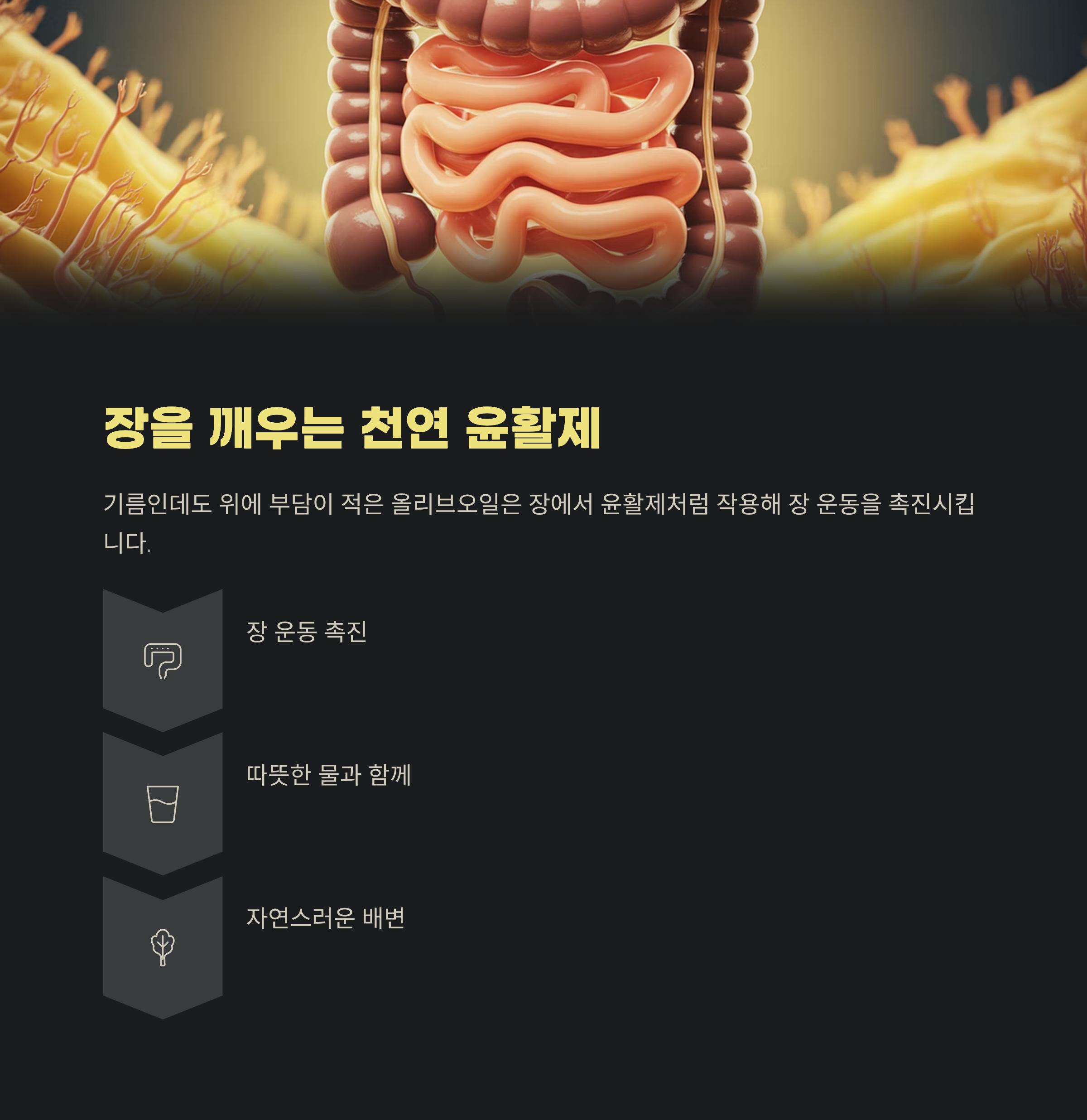 기름인데도 위에 부담이 적은 올리브오일. 장에서는 윤활제처럼 작용해 장 운동을 촉진시킵니다.