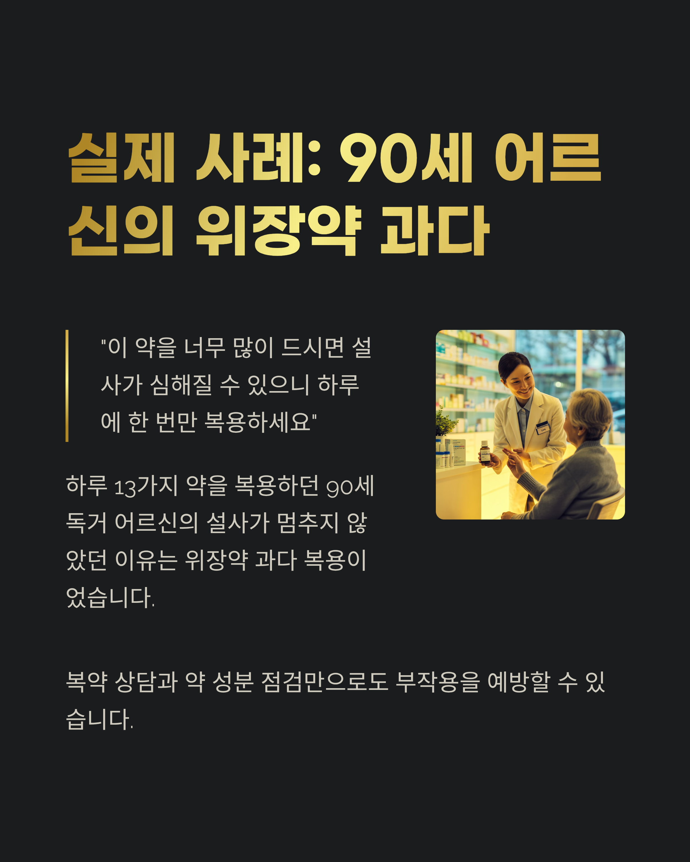 병을 고치려다 또 다른 병을 부르는 일이 없도록, 의료진과 약사, 그리고 가족의 협력이 절실한 시점입니다.