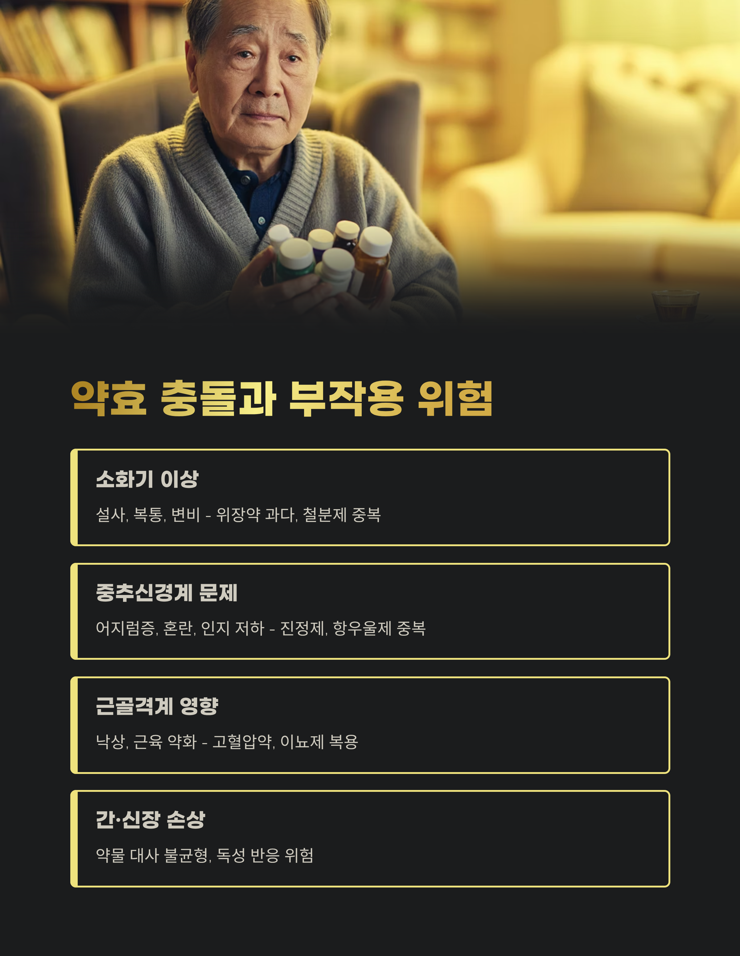 약이 너무 많아지면 몸이 소화할 수 없게 됩니다. 특히 고령자는 신장과 간 기능이 약해 약을 분해하거나 배출하는 능력이 떨어지기 때문에, 동일한 용량의 약도 더 큰 부작용을 유발할 수 있습니다.