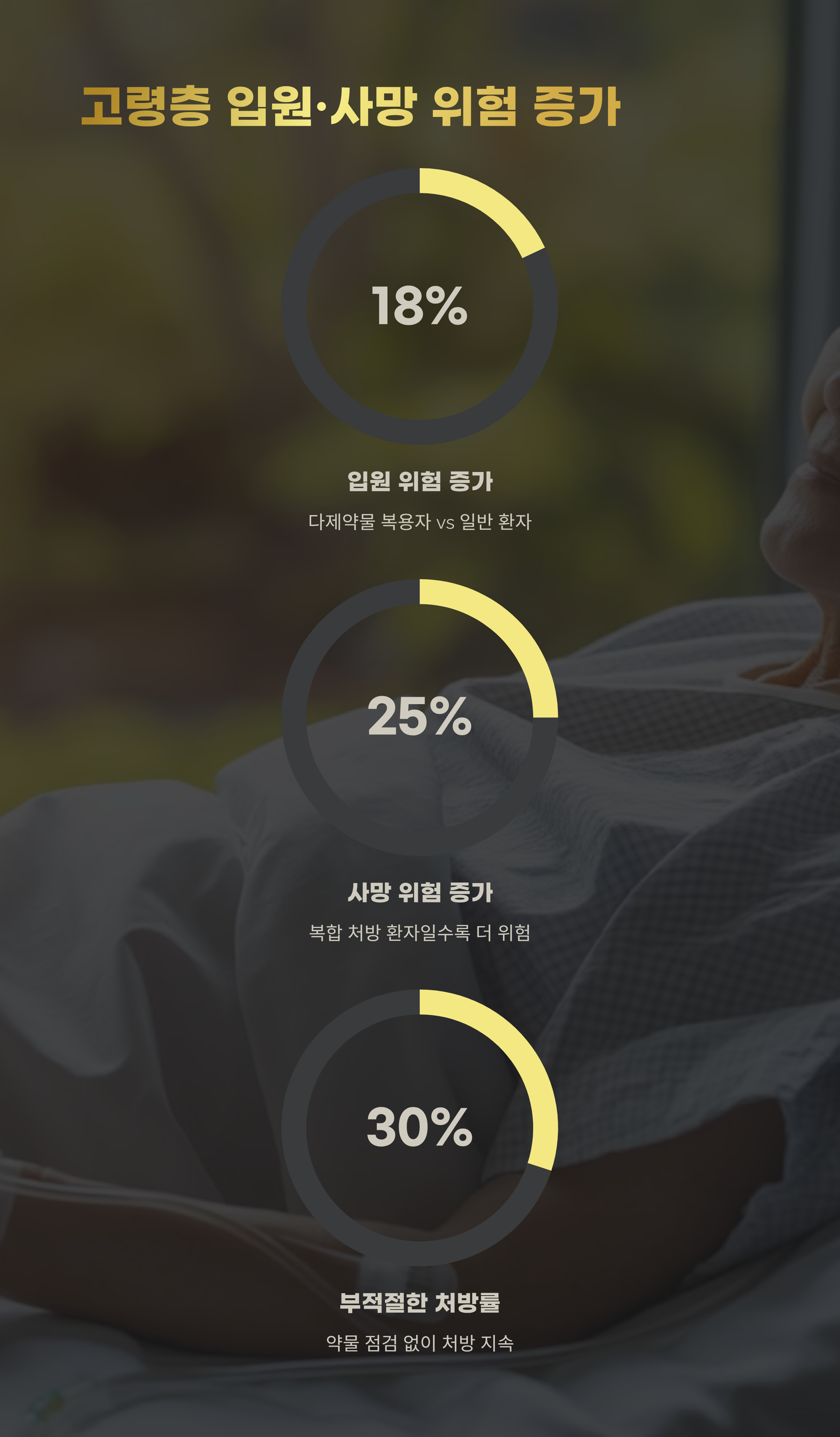 최근 연구 결과에 따르면, 다제약물을 복용하는 고령자는 비복용자에 비해 입원 위험이 18%, 사망 위험이 25% 더 높게 나타났습니다.