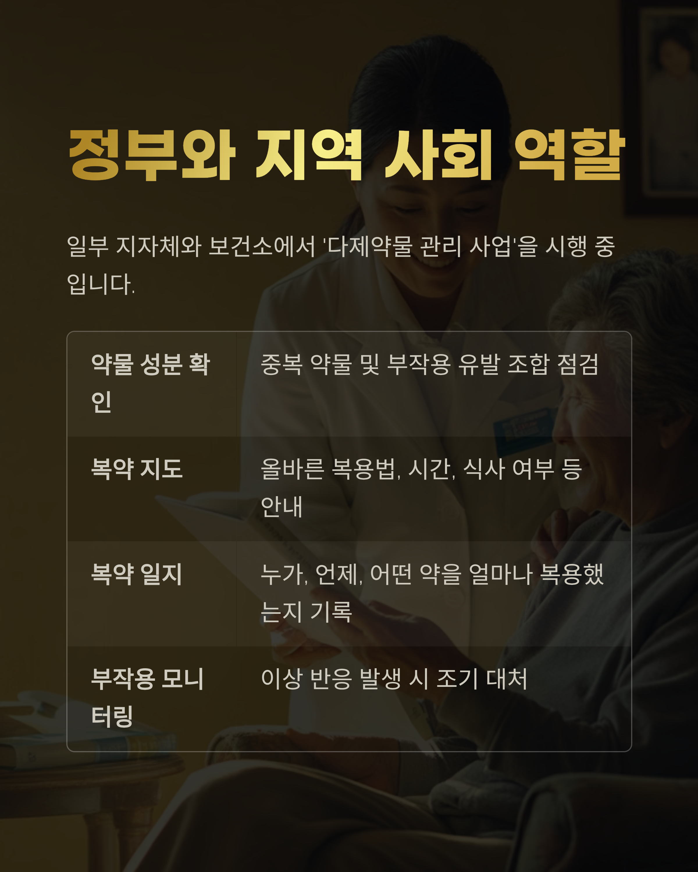 현재 일부 지자체와 보건소에서는 ‘다제약물 관리 사업’을 시행 중입니다. 이는 약사가 고령자 가정 또는 약국에서 직접 약 목록을 점검하고 불필요한 약은 줄이는 방식으로 운영됩니다.