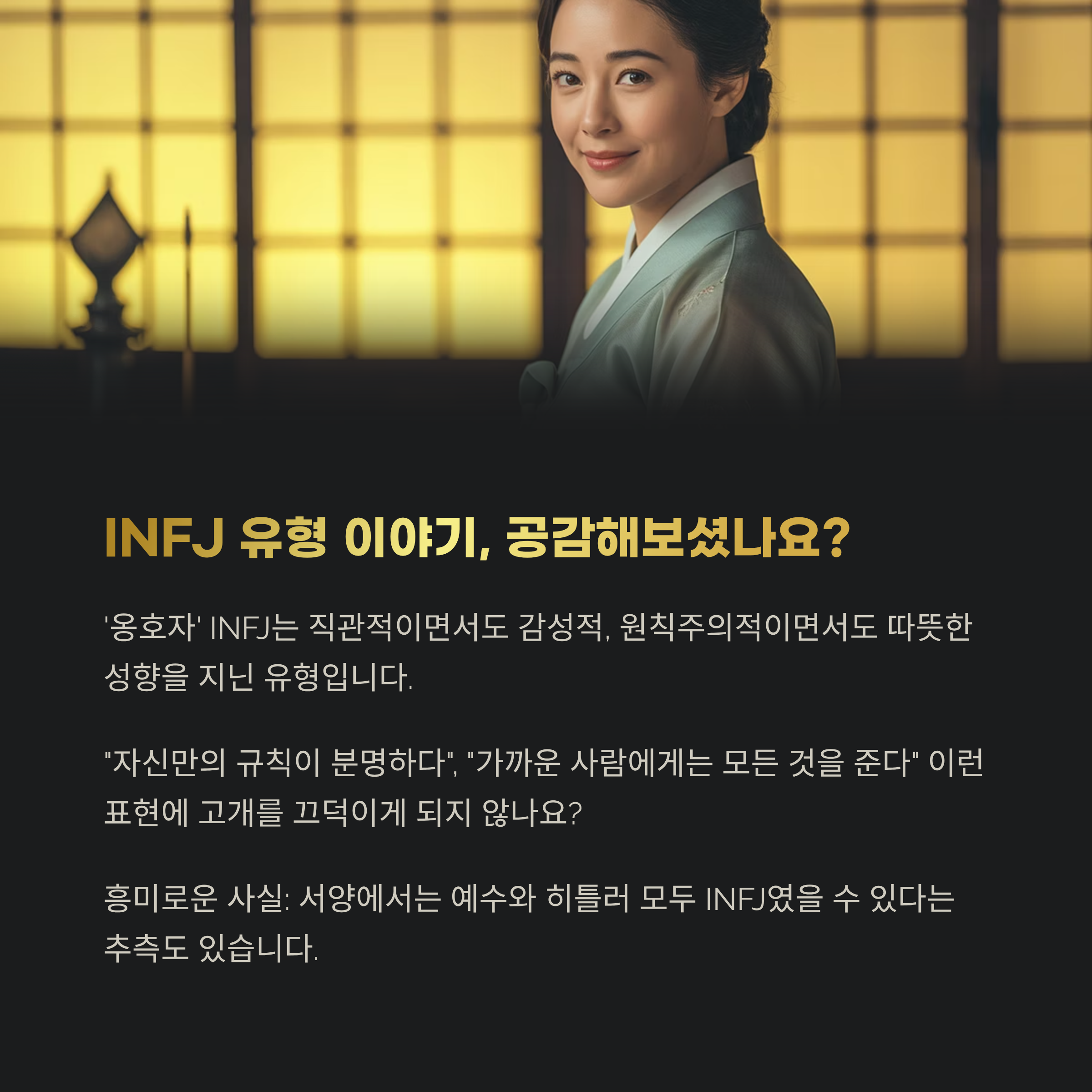 INFJ는 흔히 '옹호자'라고 불리는 유형입니다.