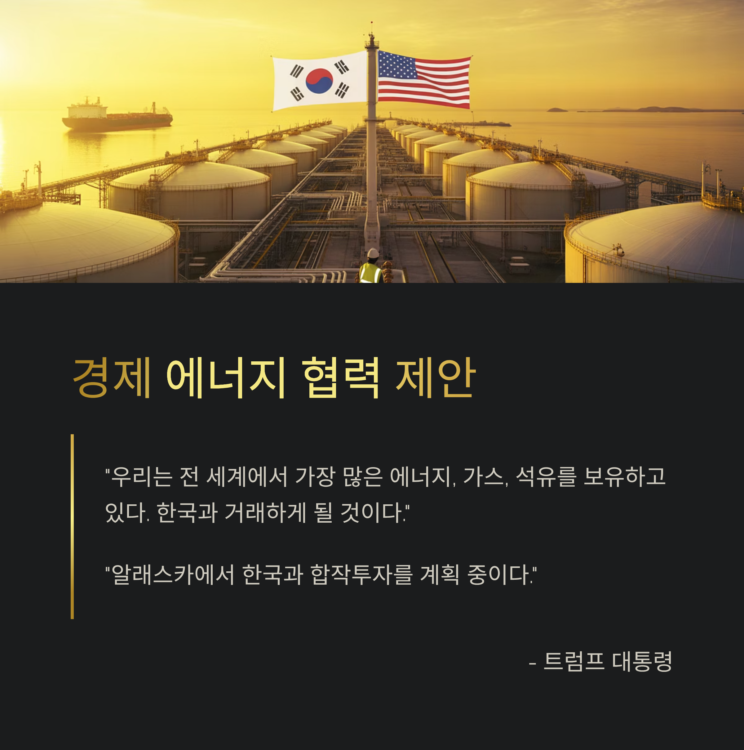 트럼프는 미국의 자원 강국 이미지를 강조하며 한국과의 에너지 협력을 제안했습니다.