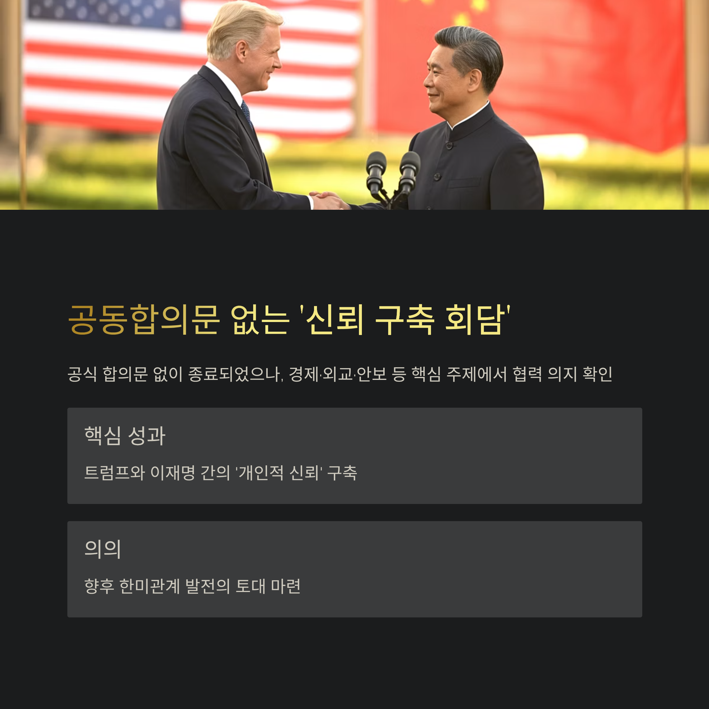 이번 회담은 공식적인 공동합의문 없이 종료되었습니다. 대신 양국은 경제·외교·안보 등 핵심 주제에서 협력의 의지를 확인했고, 무엇보다 트럼프와 이재명 간의 ‘개인적 신뢰’가 회담 전체를 관통하는 핵심 키워드로 자리잡았습니다.