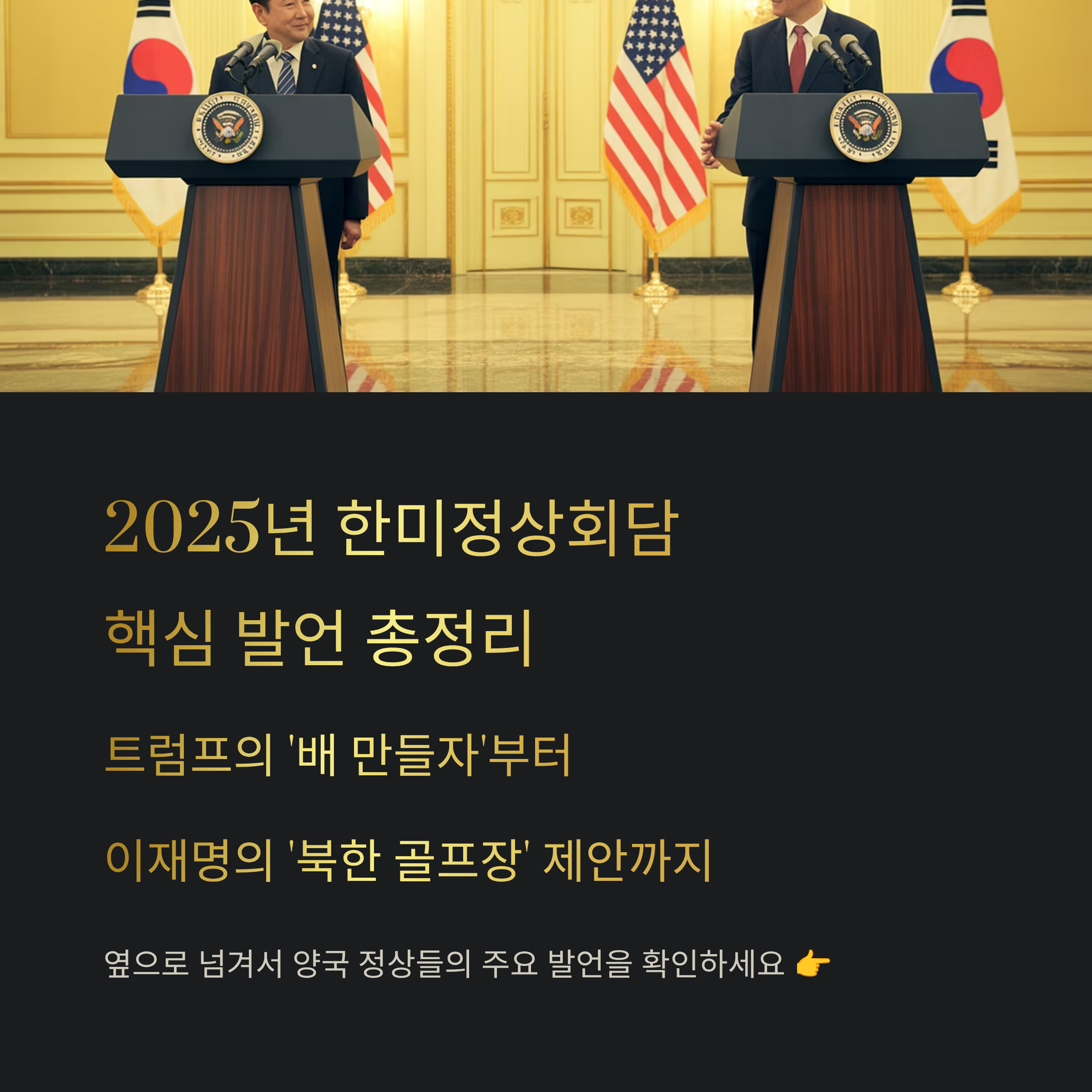 2025년 8월 25일(현지 시간), 미국 워싱턴 백악관에서 열린 한미 정상회담은 전 세계의 이목을 집중시켰습니다. 이번 회담은 이재명 대통령과 도널드 트럼프 전 대통령 간의 첫 공식 정상회담으로, 한반도 안보·북미 관계·경제 협력·종교 문제 등 다양한 이슈가 공개석상에서 논의되었습니다. 트럼프 특유의 직설적 발언과 이재명 대통령의 전략적 화법이 돋보였던 이 자리의 핵심 발언을 간결하게 정리해드립니다.