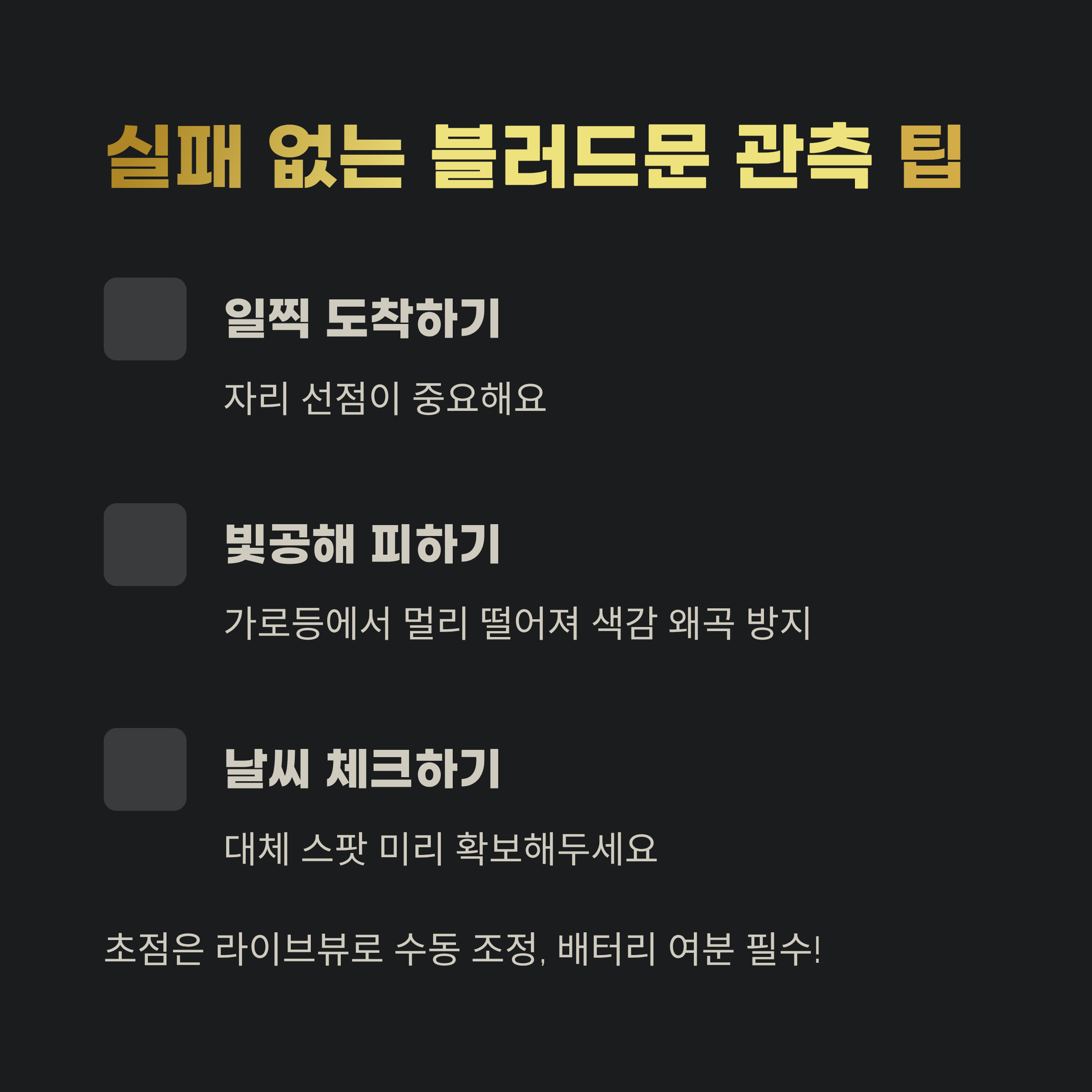 별 관측 초보자도 걱정 마세요. 다음 설정값과 준비물만 체크하면 누구나 블러드문을 멋지게 담을 수 있어요.