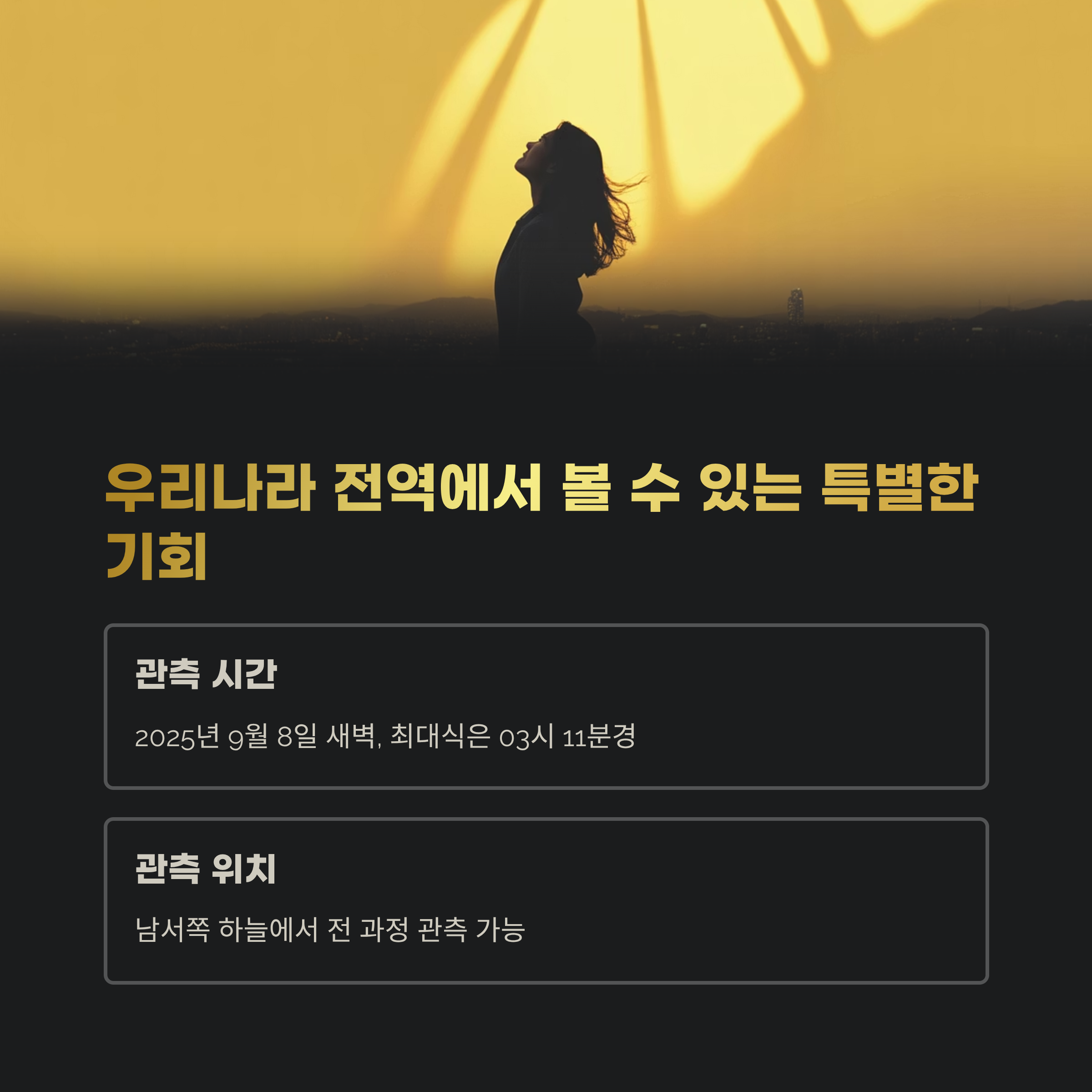 2025년 9월 8일 새벽, 서울 하늘에 특별한 우주 쇼가 펼쳐집니다. 바로 3년 만에 찾아온 개기월식, 블러드문의 순간이죠. 이번 월식은 우리나라 전역에서 전 과정을 관측할 수 있는 보기 드문 기회로, 달이 지구 그림자에 완전히 가려지면서 붉게 물드는 장관을 연출합니다. 최대식은 새벽 3시 11분경이며, 남서쪽 하늘에서 관측 가능합니다. 본문에서는 개기월식의 원리부터 관측 시간, 장소, 촬영 팁까지 한눈에 정리해드립니다. 밤하늘이 붉게 물드는 그 순간, 당신은 어디에 있을 건가요?