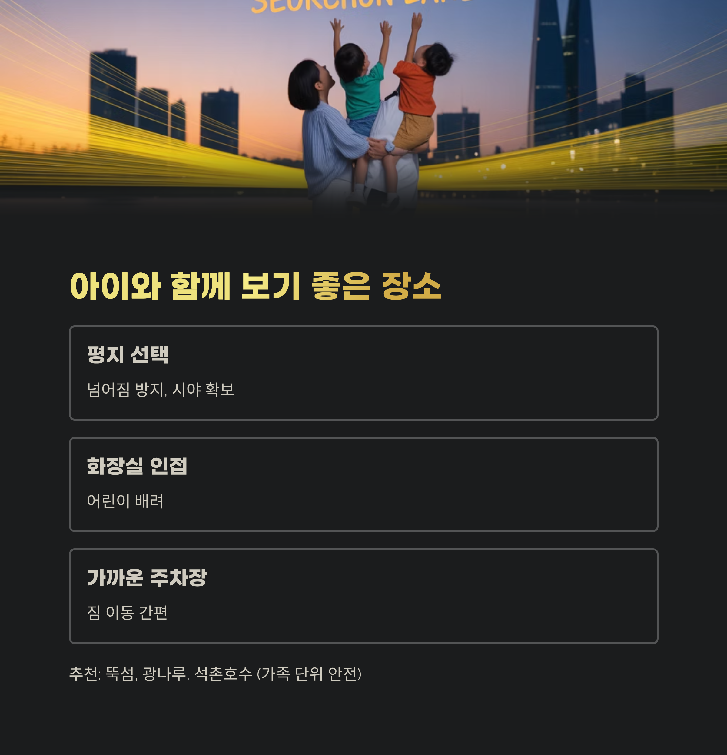 뚝섬, 광나루, 석촌호수 등은 가족 단위로 안전하게 즐길 수 있는 대표 명당입니다.