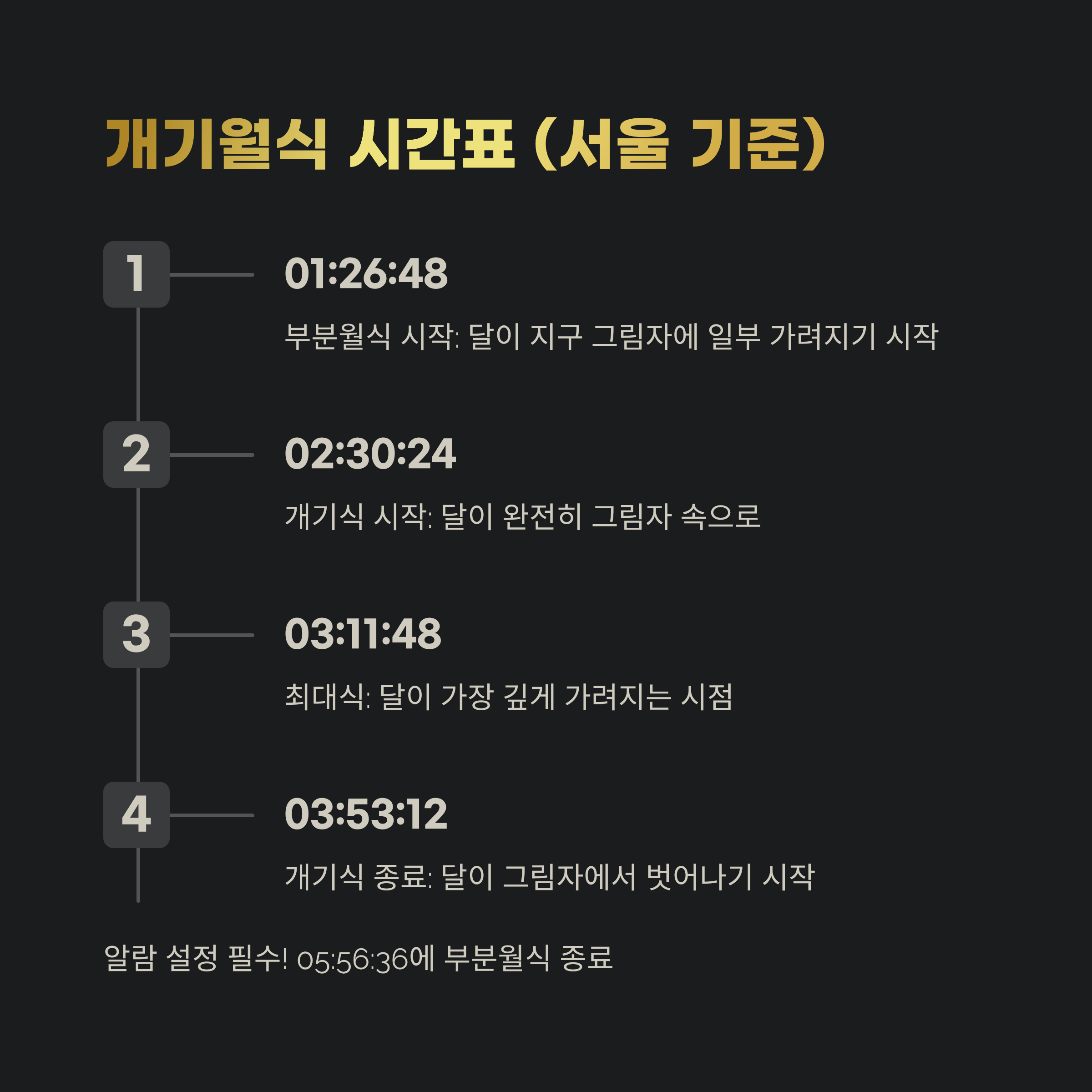 이번 개기월식은 새벽부터 시작됩니다. 한눈에 보는 시간표를 참고해 알람을 맞춰보세요.