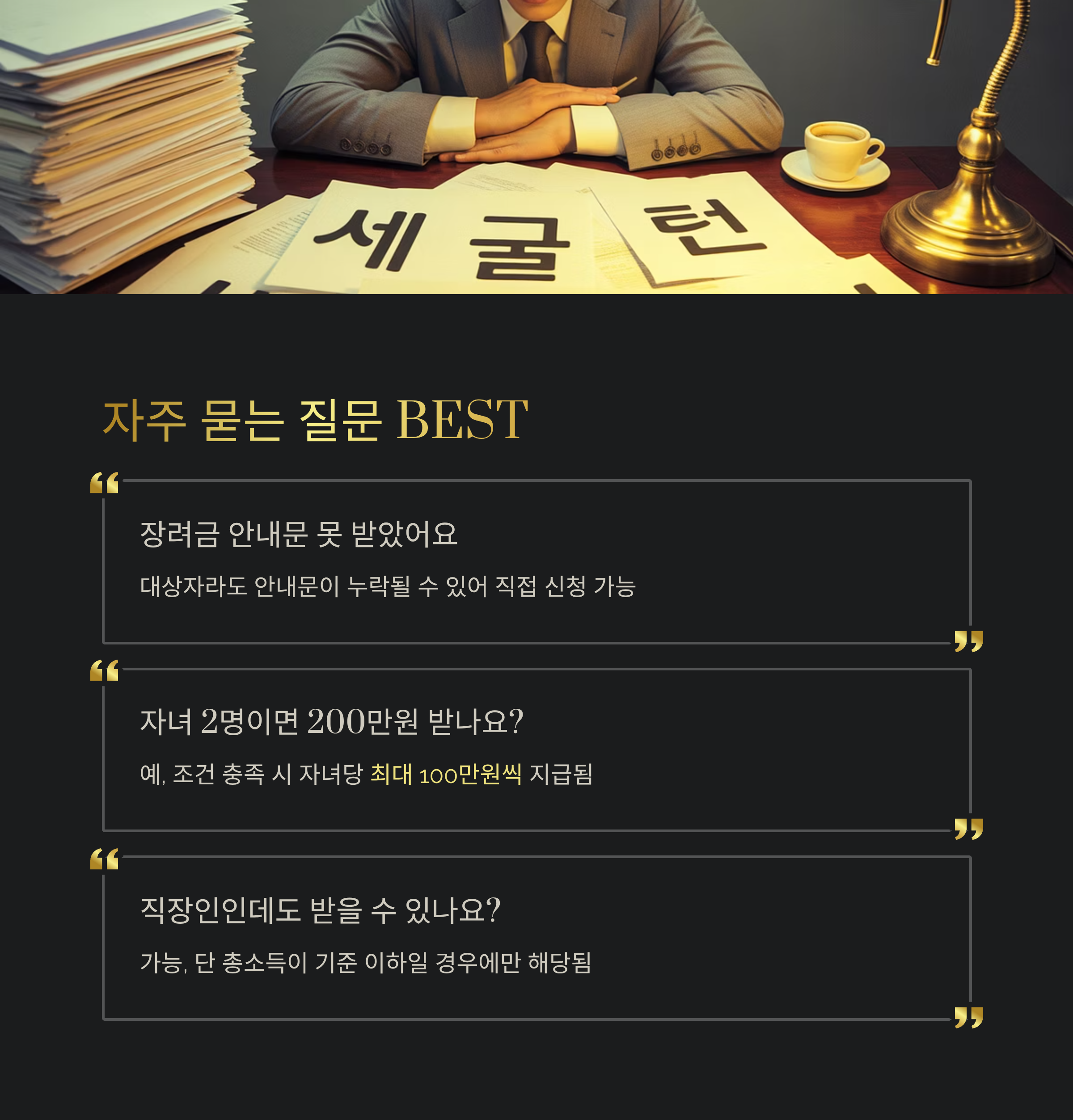 | Q. 자녀 2명이면 200만원 받나요? | A. 예, 조건 충족 시 자녀당 최대 100만원씩 지급됨 |