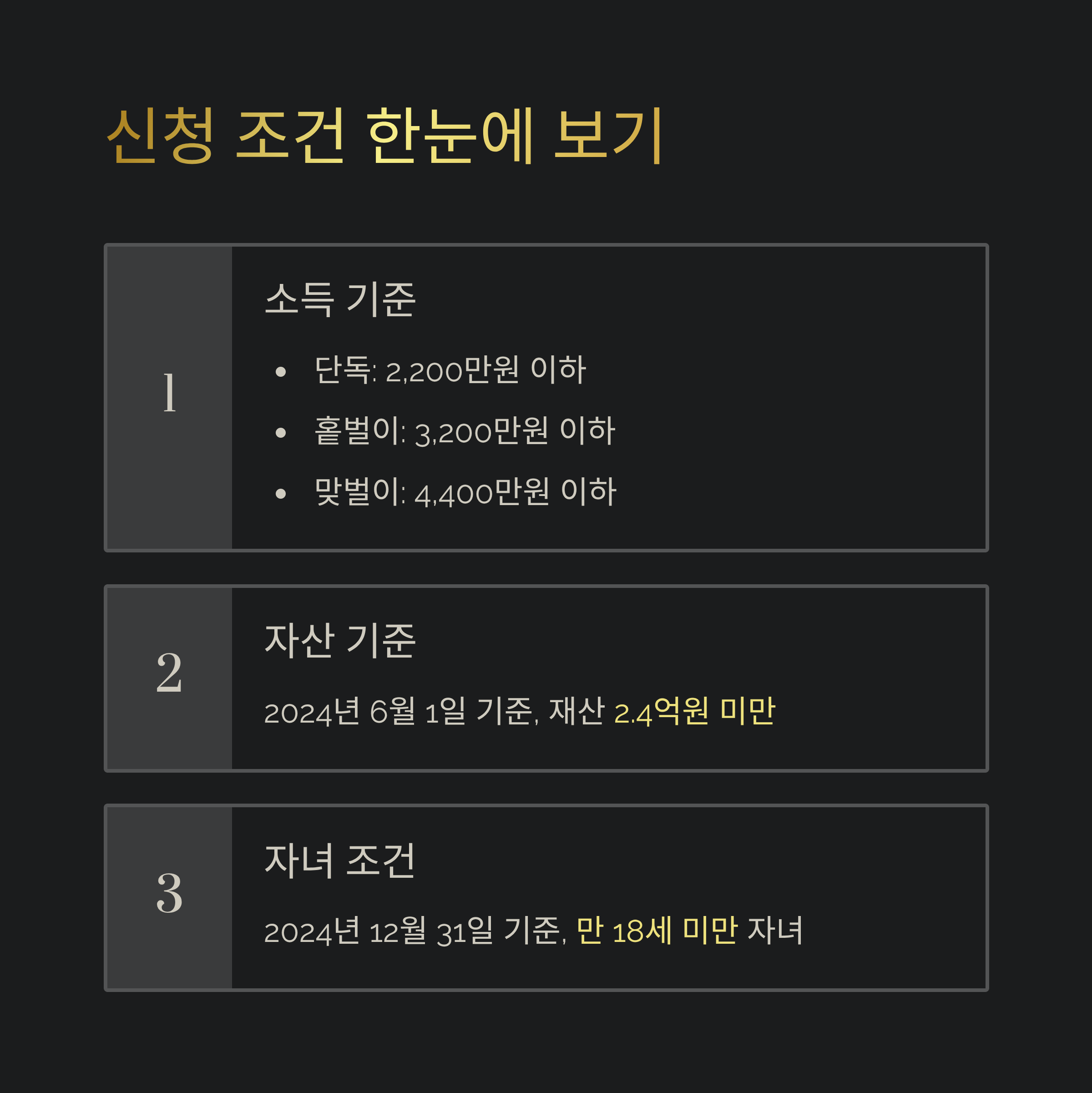 | 자산 기준 | 2024년 6월 1일 기준, 재산 2.4억원 미만 | 동일 |