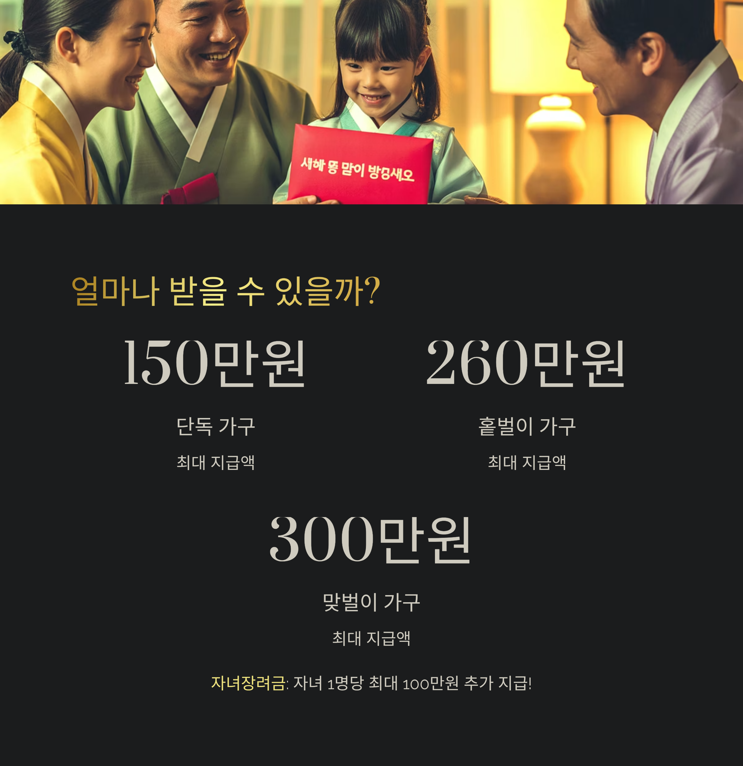 가구 형태(단독, 홑벌이, 맞벌이)에 따라 연 최대 수십만 원에서 수백만 원까지 지급됩니다.