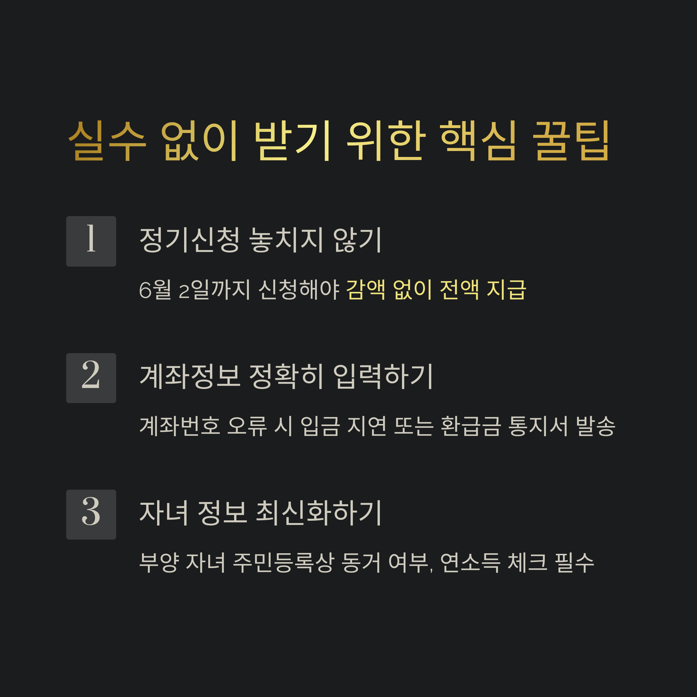 - 정기신청 놓치지 않기: 6월 2일까지 신청해야 감액 없이 전액 지급
