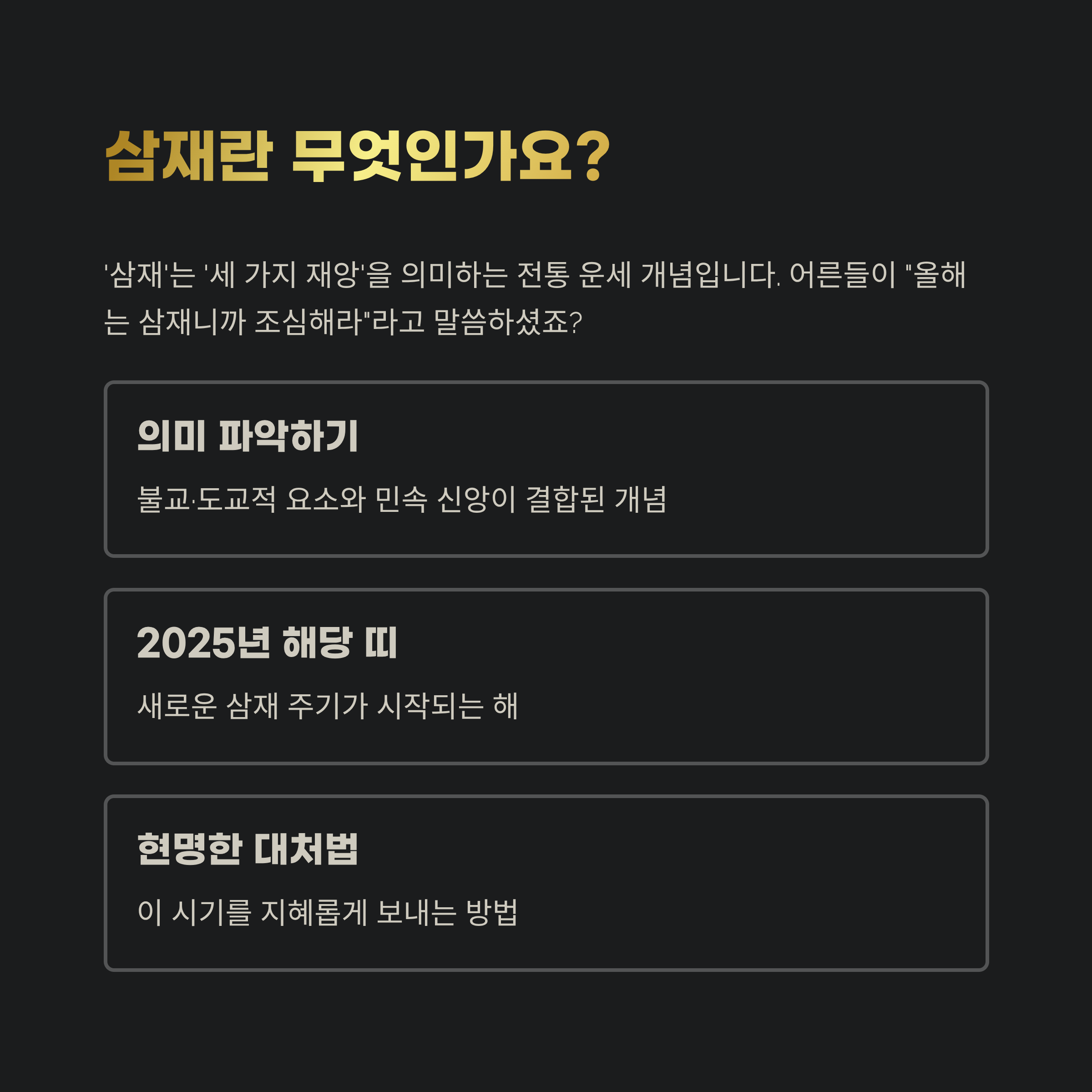 하지만 실제로 삼재가 뭔지, 왜 조심해야 하는지, 그리고 2025년에 해당하는 띠가 누구인지 정확히 아는 사람은 드뭅니다.