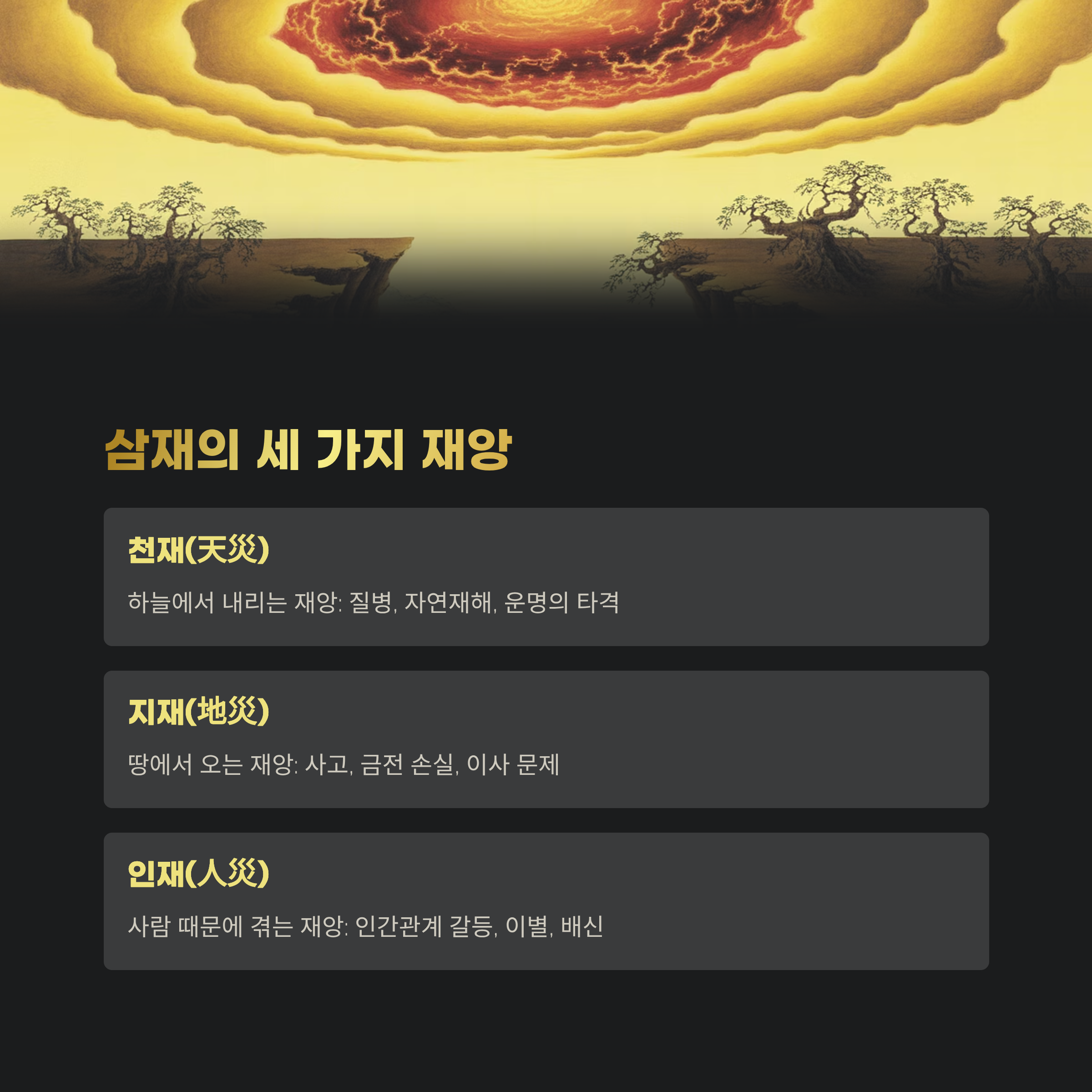| 천재(天災) | 하늘에서 내리는 재앙 | 질병, 자연재해, 운명의 타격 |