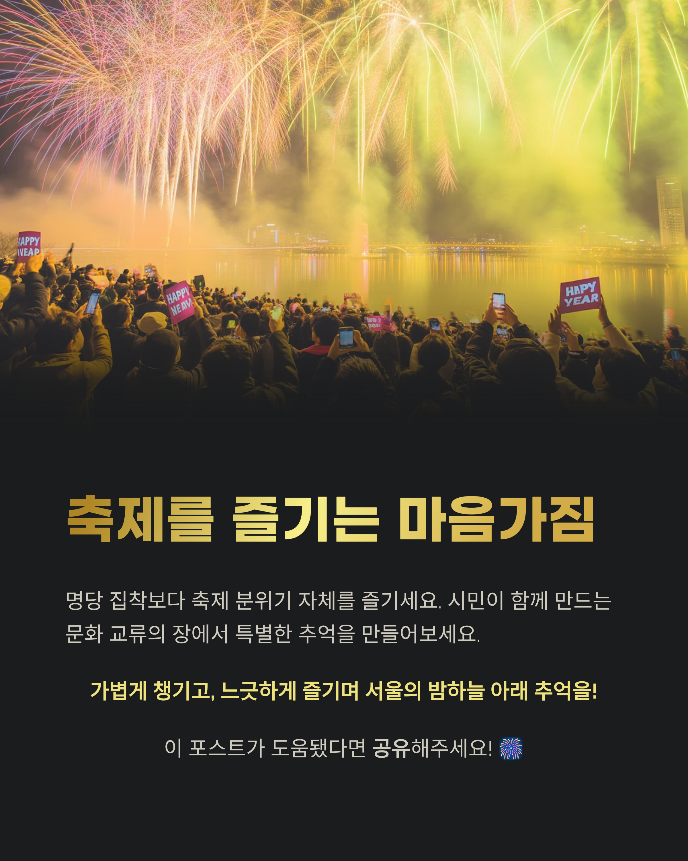 서울세계불꽃축제는 단순한 불꽃 관람이 아니라 시민이 함께 만드는 문화 교류의 장입니다. 명당에 대한 집착보다, 축제 그 자체의 분위기를 즐긴다는 마음으로 참여하신다면 더욱 특별한 기억이 될 것입니다. 가볍게 챙기고, 느긋하게 즐기며 서울의 밤하늘 아래 추억을 만들어 보세요.