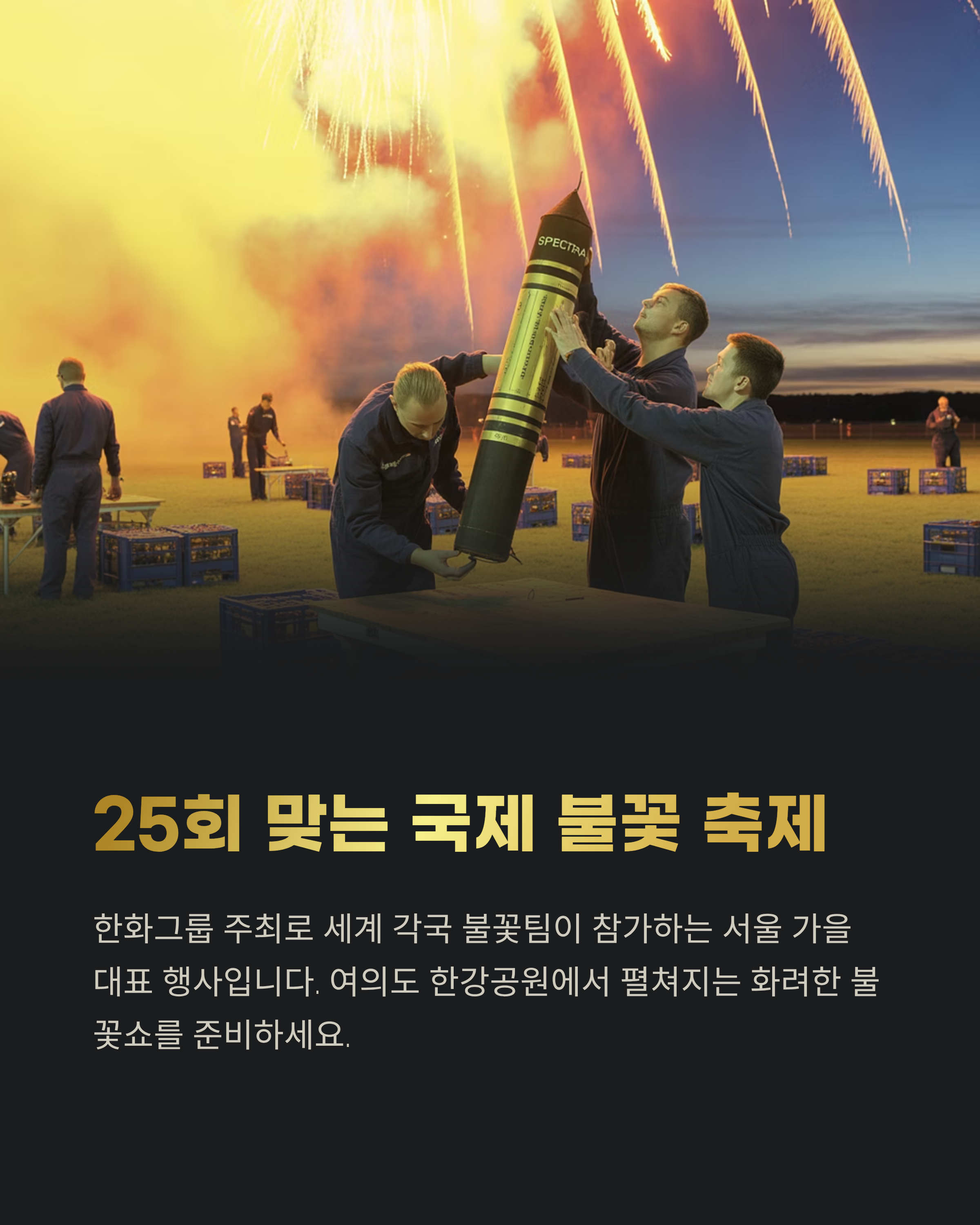 서울 가을을 대표하는 대규모 야외 행사인 ‘서울세계불꽃축제’가 2025년에도 어김없이 찾아옵니다. 올해로 25회를 맞는 이번 축제는 한화그룹이 주최하며, 세계 각국 불꽃팀이 참가하는 국제적인 불꽃 경연의 장이 될 예정입니다. 여의도 한강공원 일대를 중심으로 펼쳐지는 화려한 불꽃과 함께, 관람을 계획하고 있다면 지금부터 꼼꼼히 준비해보세요.