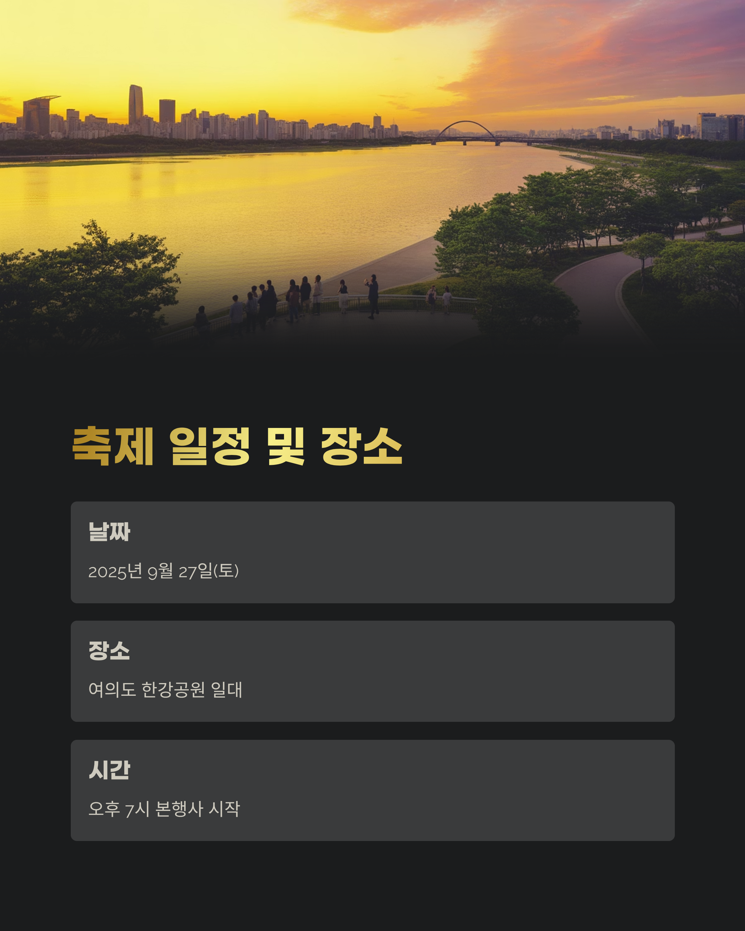- 시간: 오후 7시경 본행사 시작 (부대행사 오후 1시부터 진행)