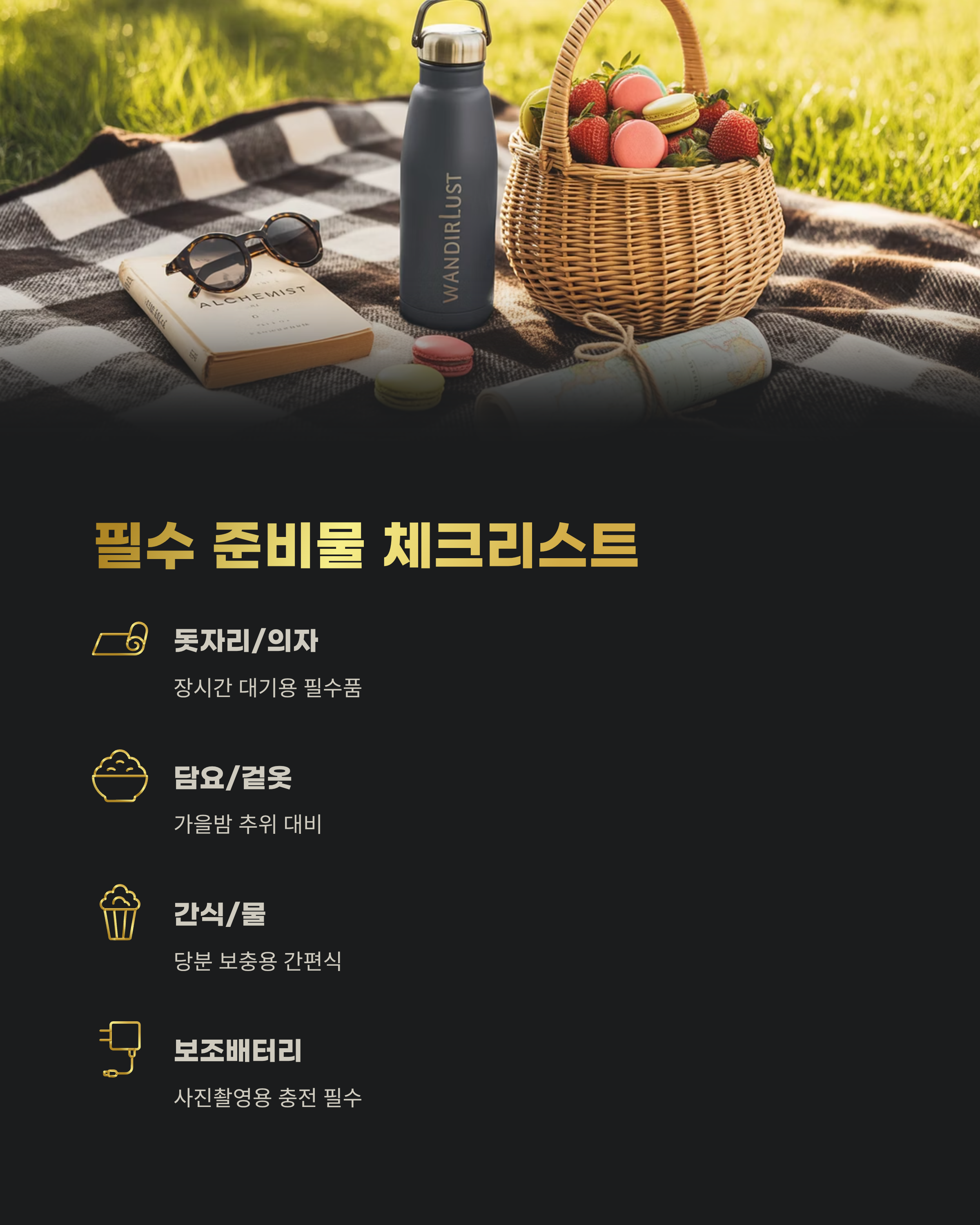 오랜 시간 야외에서 대기해야 하는 축제인 만큼, 적절한 준비물은 필수입니다. 가을 밤 강변의 쌀쌀한 날씨도 고려해야 합니다.