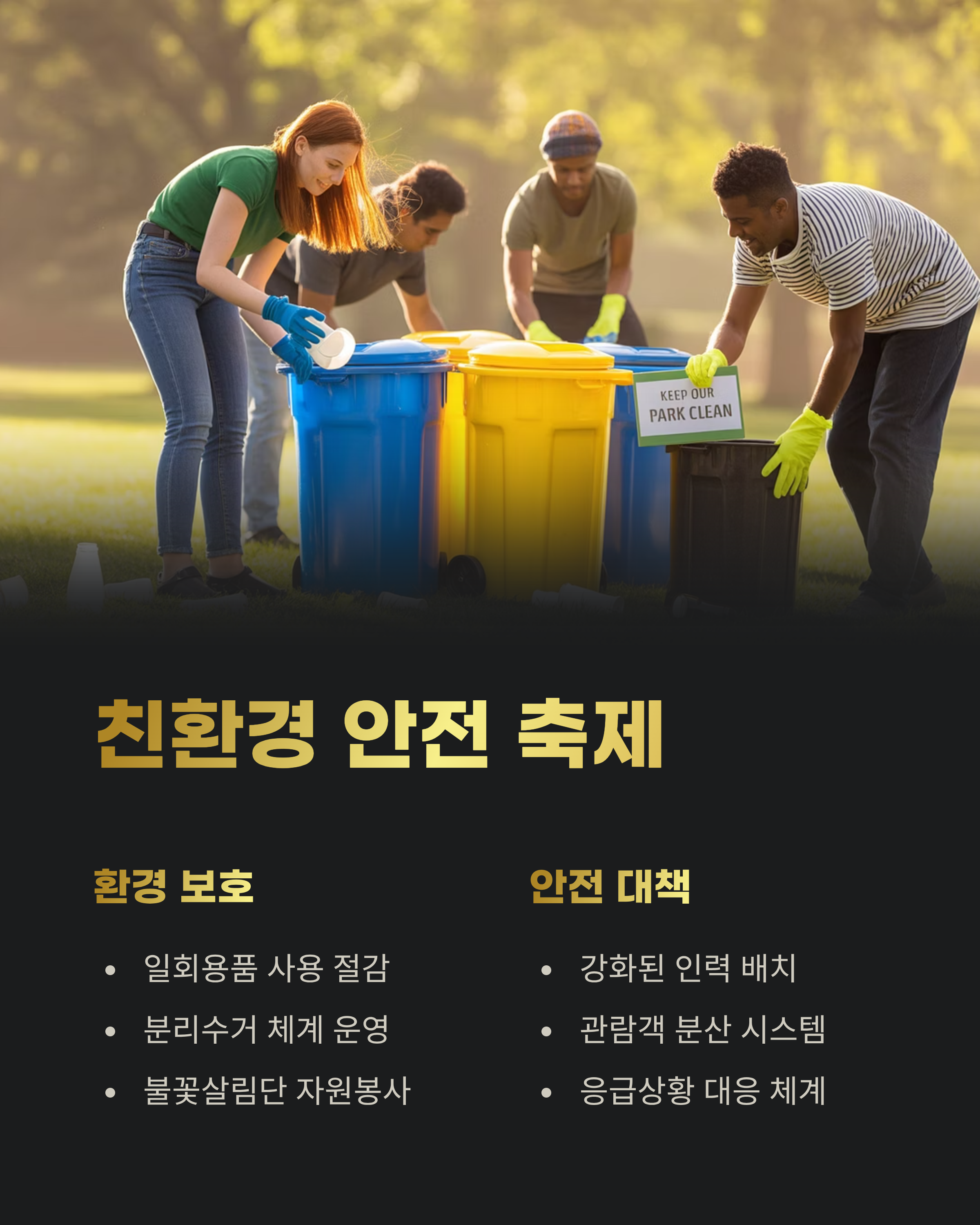 2025년에는 친환경 축제 운영과 강화된 안전 대책이 더욱 강조됩니다. 일회용품 사용 절감, 분리수거 체계 마련, 자원봉사단 ‘불꽃살림단’ 운영 등 시민 참여형 운영도 이어지고 있습니다. 2022년 이태원 사고 이후 강화된 인력 배치와 관람객 분산 대책도 시행될 예정입니다.