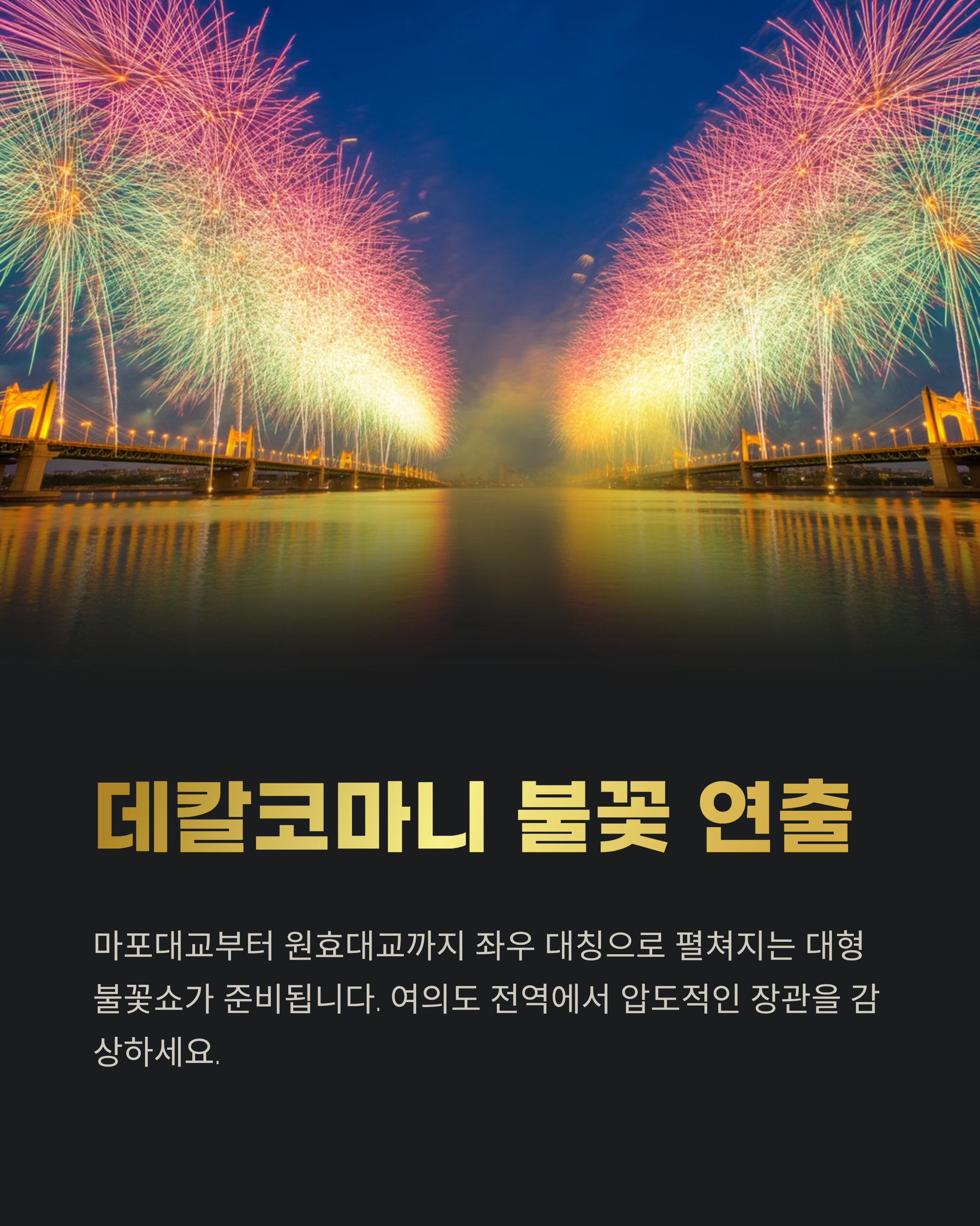 올해의 시그니처 연출로는 ‘데칼코마니(Decalcomanie)’ 기법이 소개됐습니다. 마포대교부터 원효대교, 한강철교 구간까지 좌우 대칭으로 펼쳐지는 대형 불꽃 쇼가 준비되어, 여의도 전역 어디서 보더라도 압도적인 장관을 감상할 수 있을 것으로 기대됩니다.