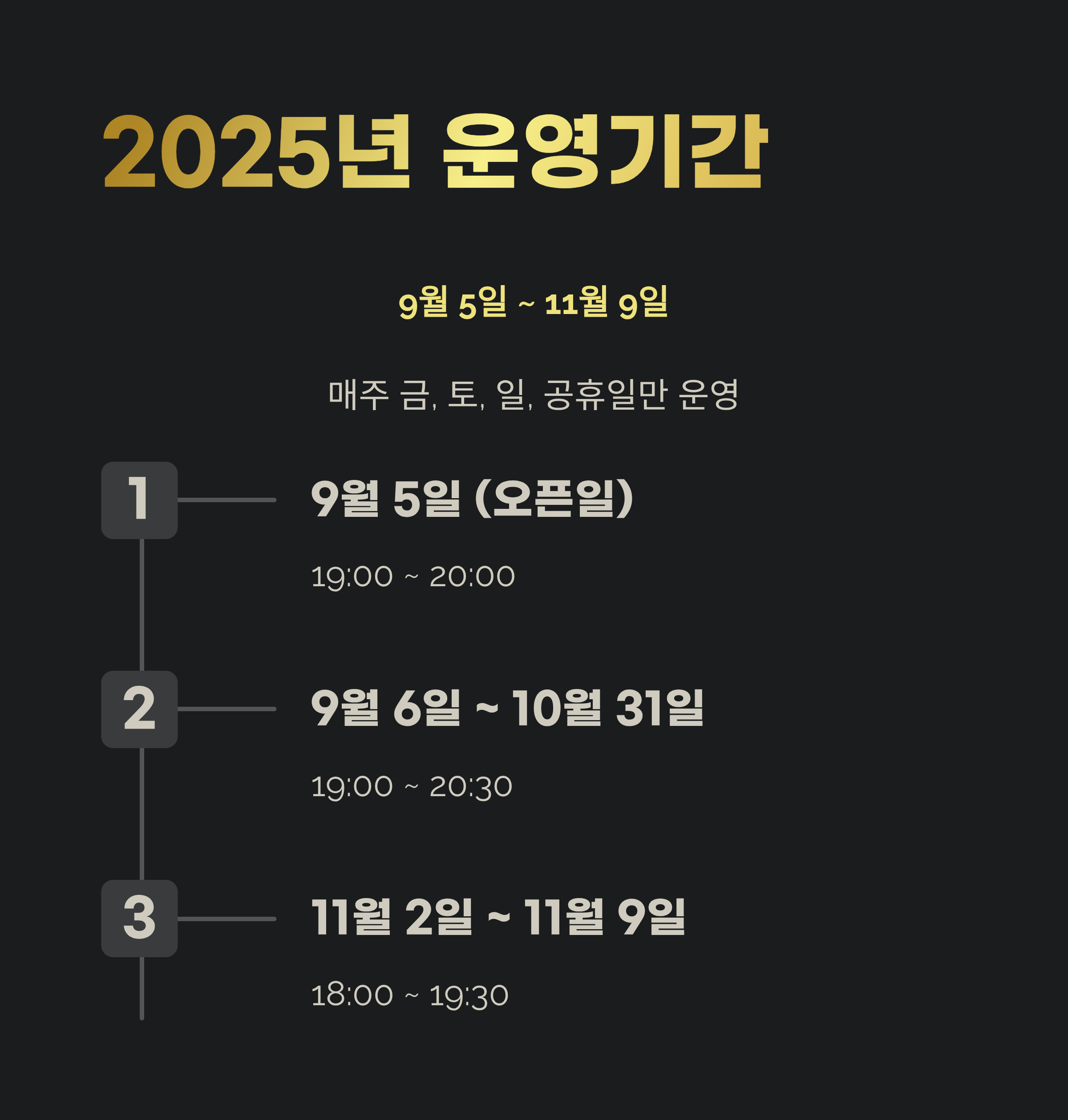 올해 시즌은 9월 5일부터 11월 9일까지! 매주 금, 토, 일, 공휴일에만 운영됩니다.