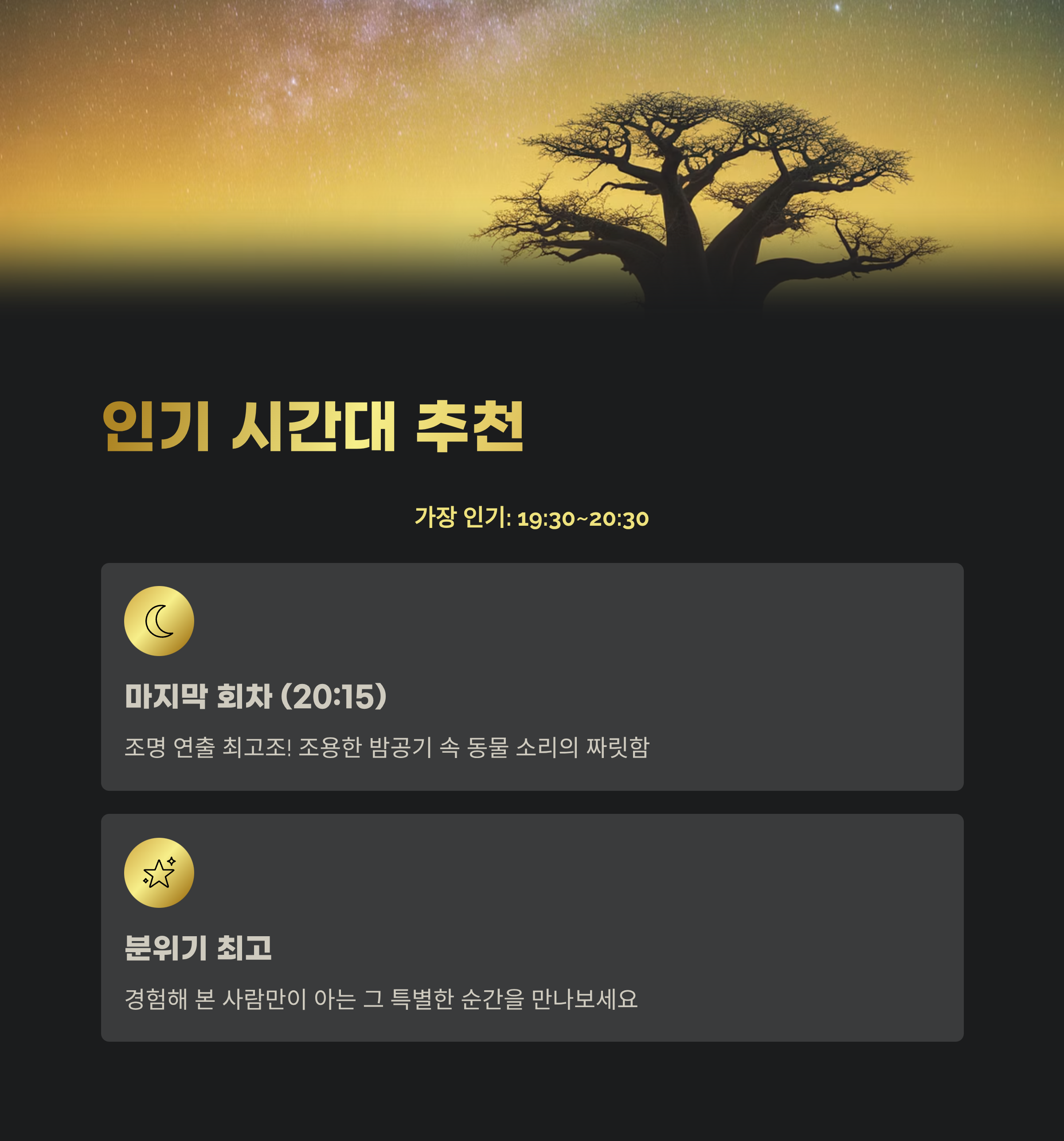 - 마지막 회차(20:15)는 조명 연출이 가장 극대화되며 분위기가 최고라는 평이 많아요.