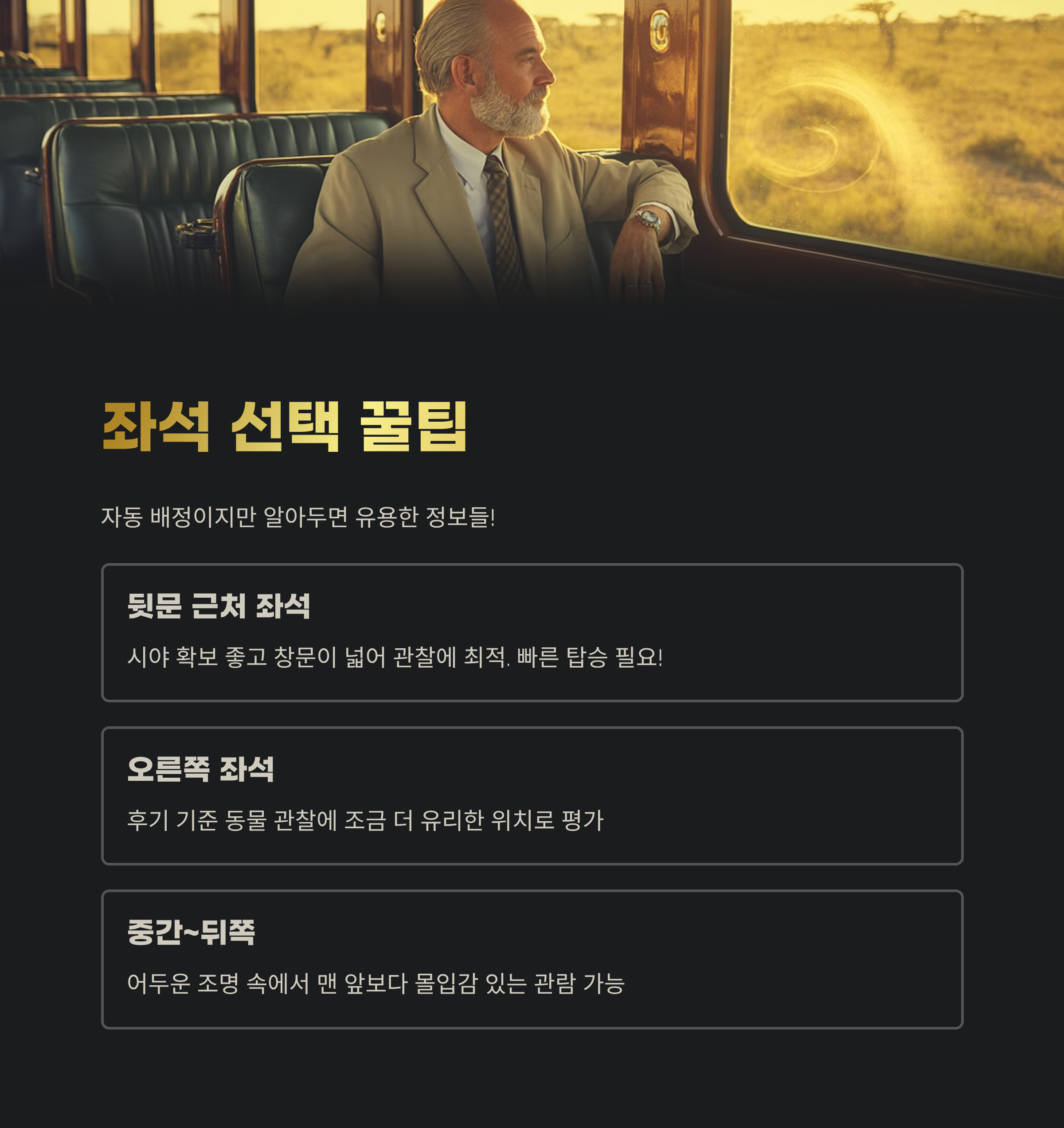 | 오른쪽 좌석 | 후기 기준 동물 관찰에 조금 더 유리한 위치로 평가 | 특정 시간대는 반대편이 더 좋을 수도 있음 |