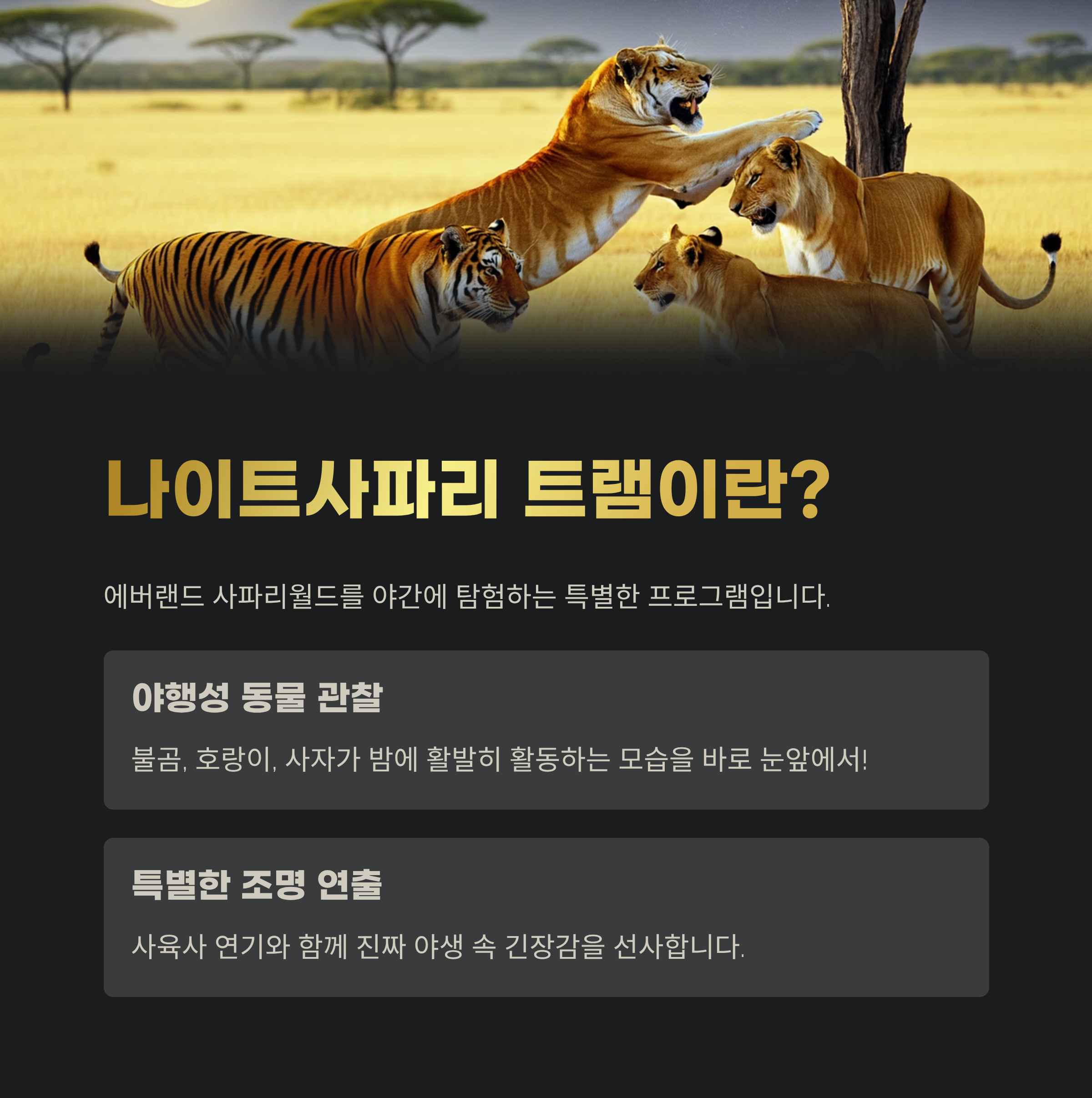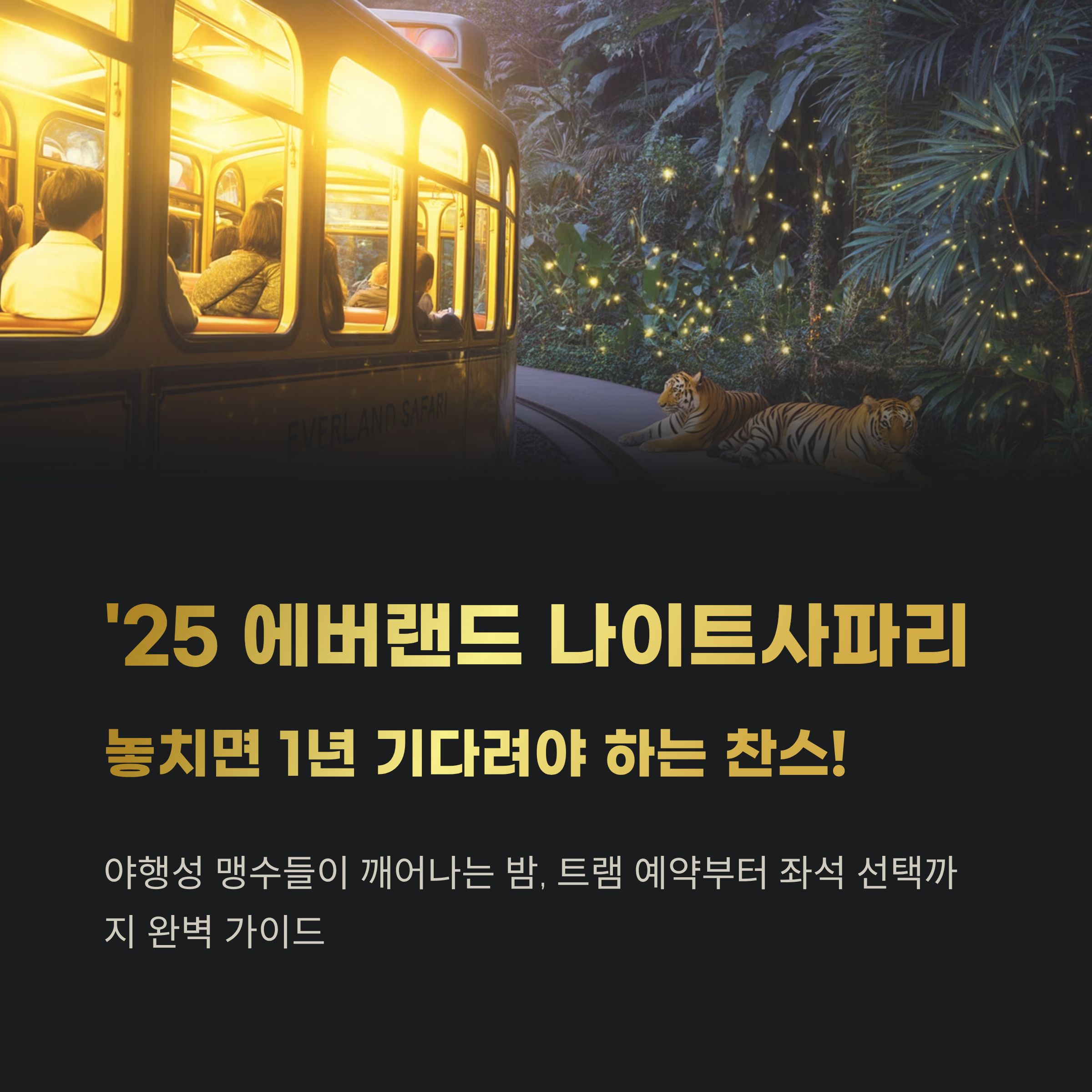 에버랜드의 밤은 다릅니다. 바로 야행성 맹수들이 깨어나는 순간이기 때문인데요. 사파리월드의 핵심 체험 중 하나인 '나이트사파리 트램'은 매년 가을에만 한정 운영되며, 시작과 동시에 빠르게 매진되는 인기 프로그램입니다. 오늘은 예약 방법, 운영기간, 좌석 선택 팁까지 전부 정리해드릴게요.