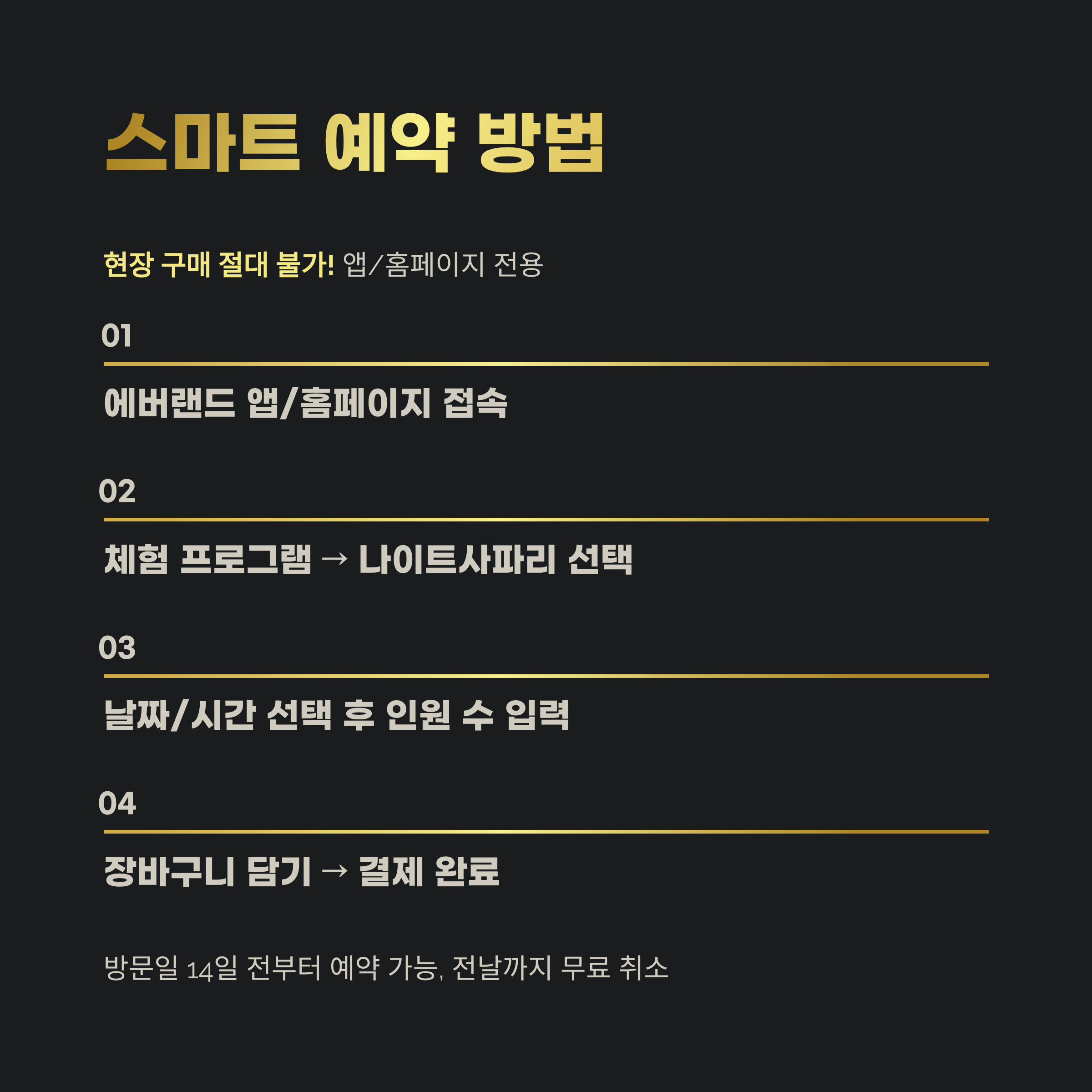에버랜드 나이트사파리 트램은 스마트 예약 전용으로, 앱 또는 홈페이지를 통해서만 가능합니다. 현장 구매는 절대 안 되니 유의하세요.