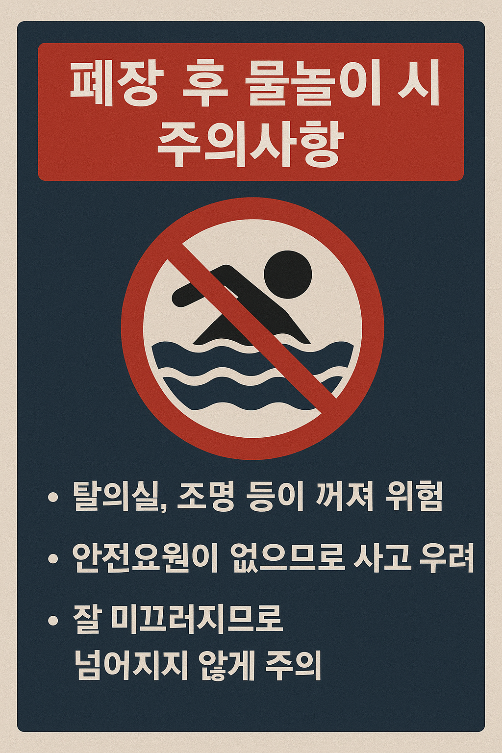 해수욕장이 폐장했다고 바다를 이용하지 못하는 것은 아닙니다. 단, 폐장 이후에는 안전요원이 배치되지 않으며, 샤워실, 파라솔, 물놀이 시설 등의 편의시설도 운영되지 않습니다.