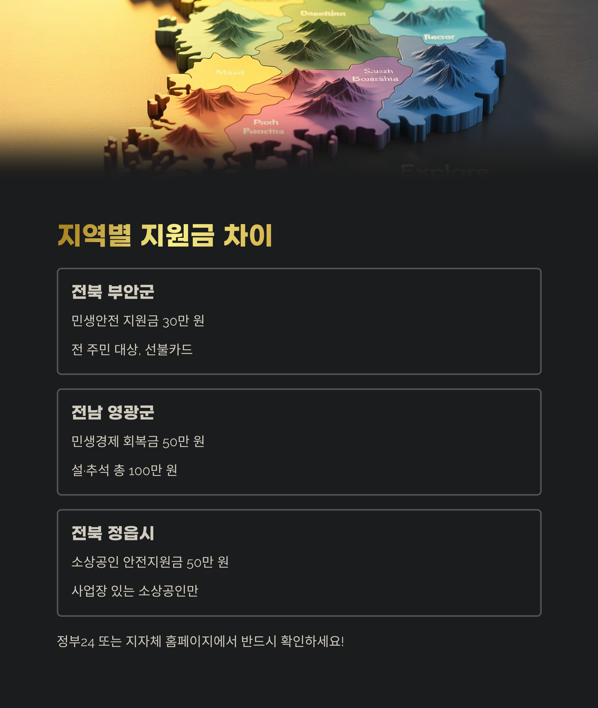 | 전북 부안군 | 민생안전 지원금 | 30만 원 | 전 주민 대상, 선불카드 |