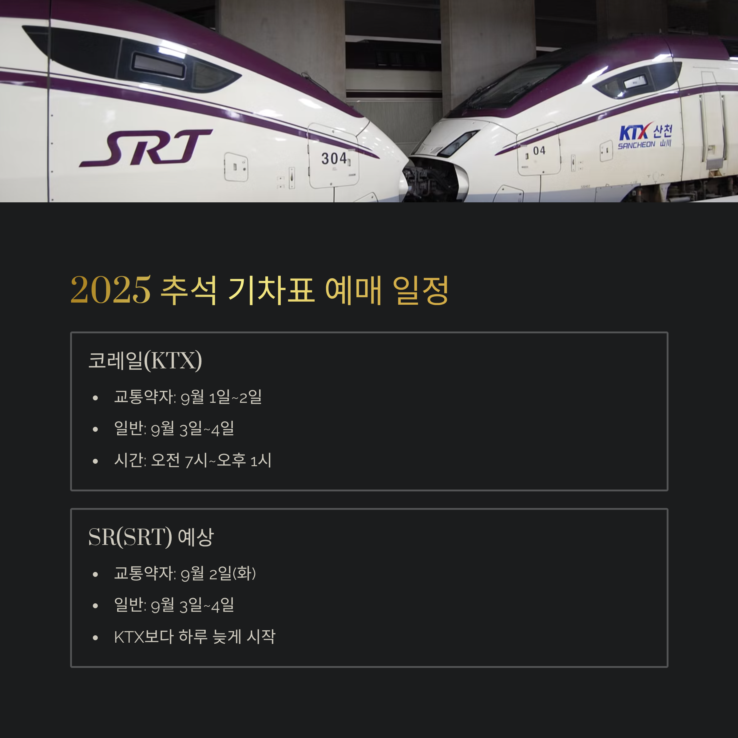 | 예매 시작일 | KTX: 9/1~4, SRT:9/2~4 (예상) |