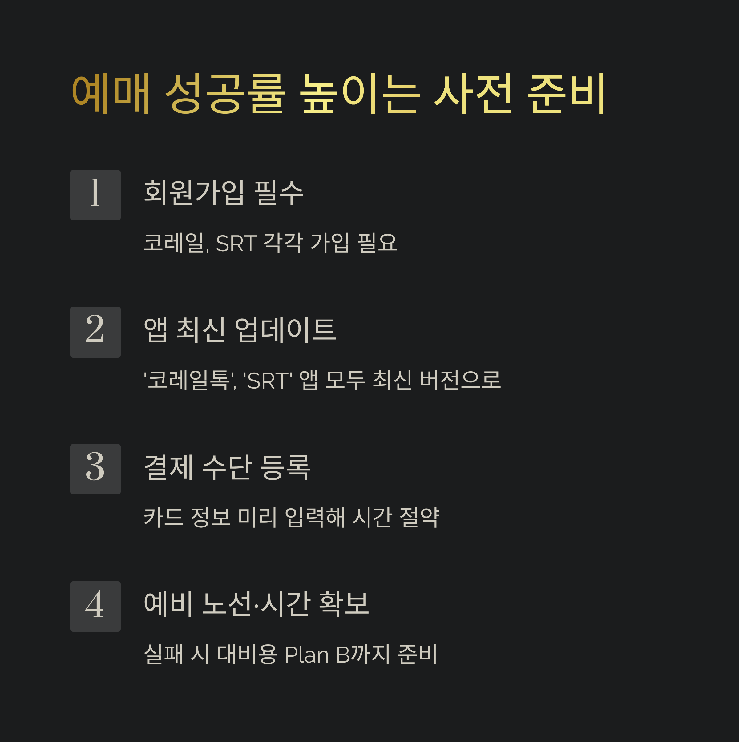 - 회원가입 필수: 코레일, SRT 각각 가입 필요