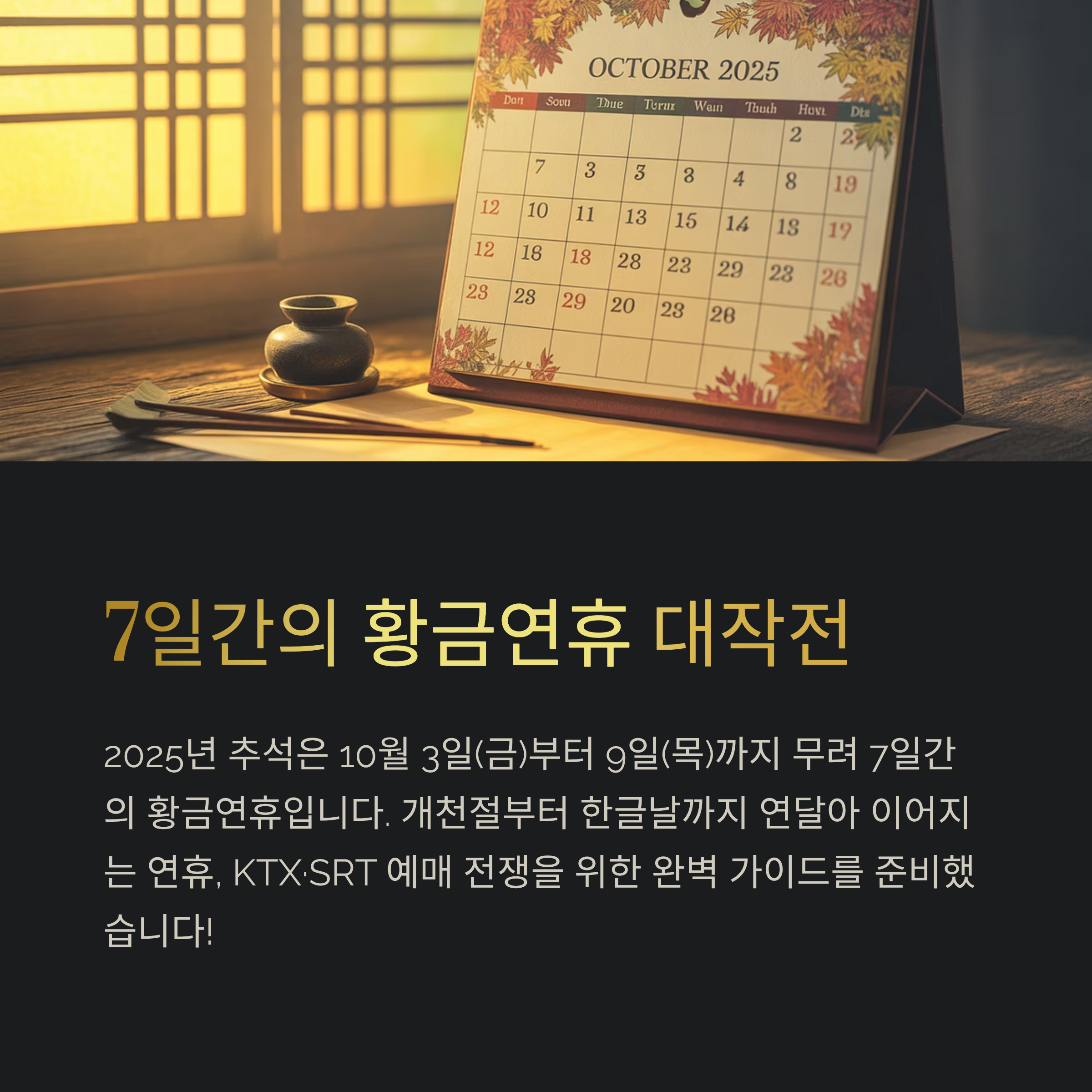 2025년 추석은 무려 10월 3일 금요일부터 9일 목요일까지 이어지는 7일간의 황금연휴입니다. 개천절부터 한글날까지 연달아 붙은 일정 덕분에 고향 방문이나 여행을 계획한 분들이 많을 텐데요. 하지만 긴 연휴만큼 치열한 KTX·SRT 예매 전쟁도 피할 수 없습니다.