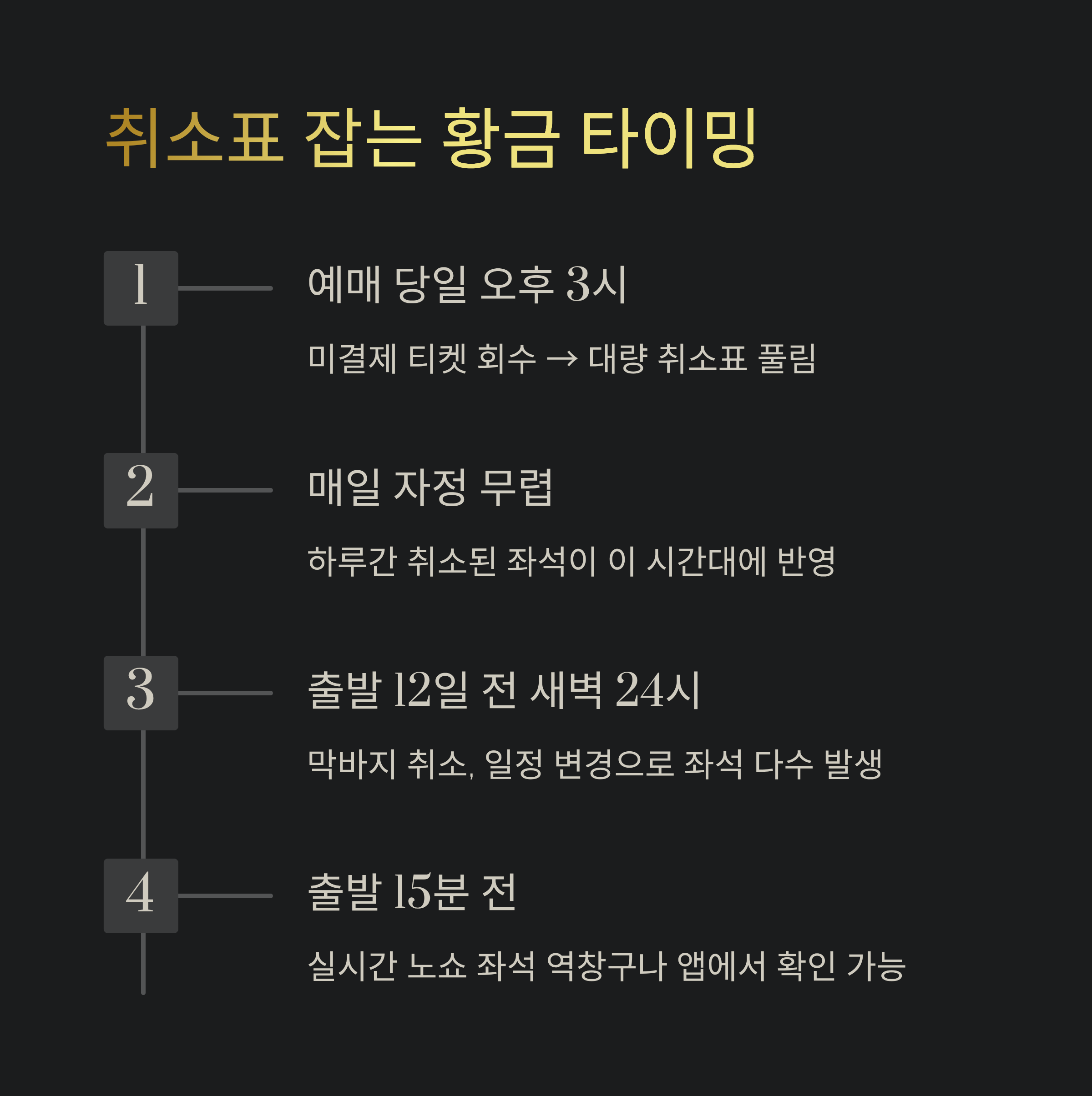 | 실패 시 전략 | 오후 3시 / 자정 / 새벽 2~4시 취소표 노리기 |