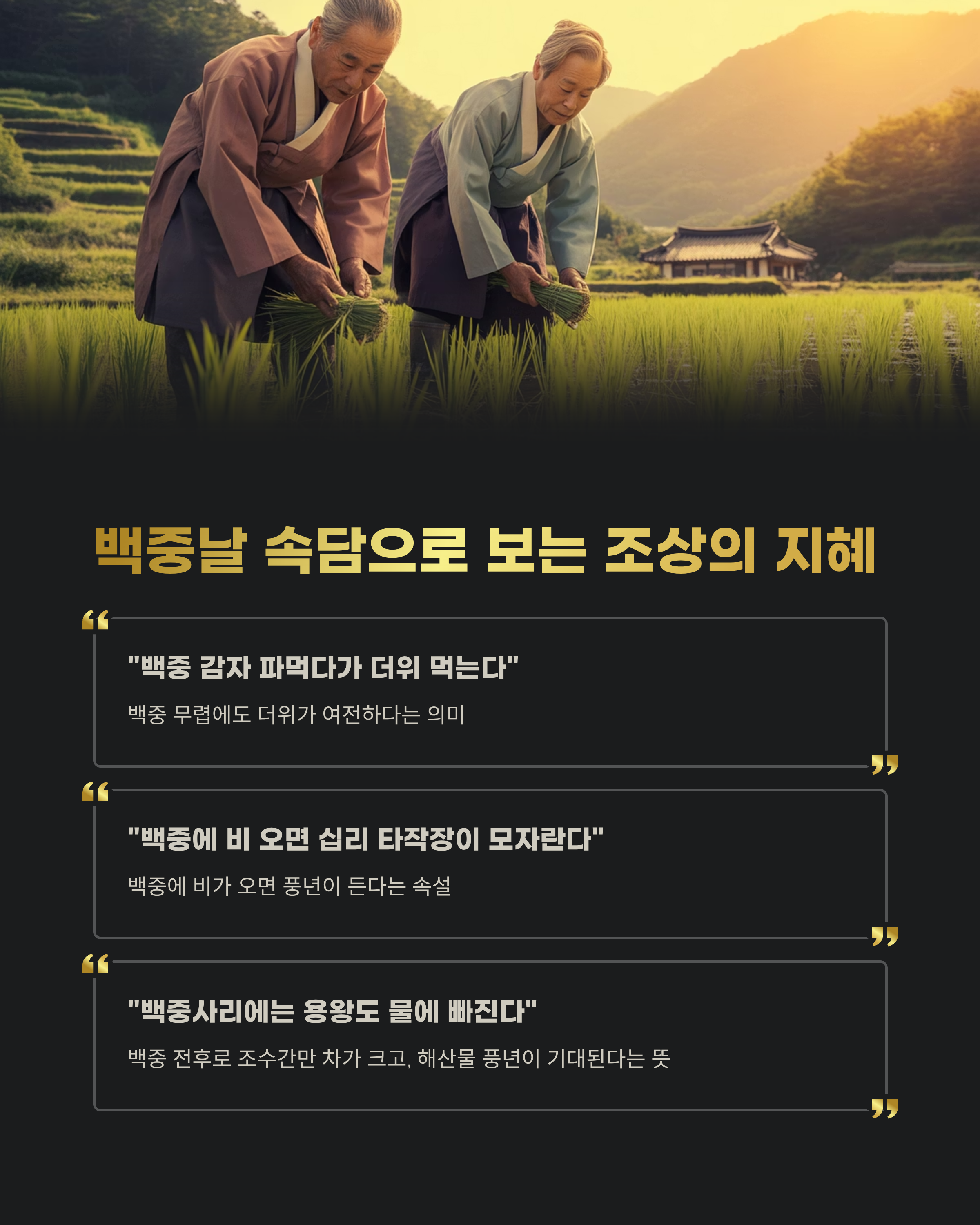 → 백중에 비가 오면 풍년이 든다는 속설 - “백중사리에는 용왕도 물에 빠진다”