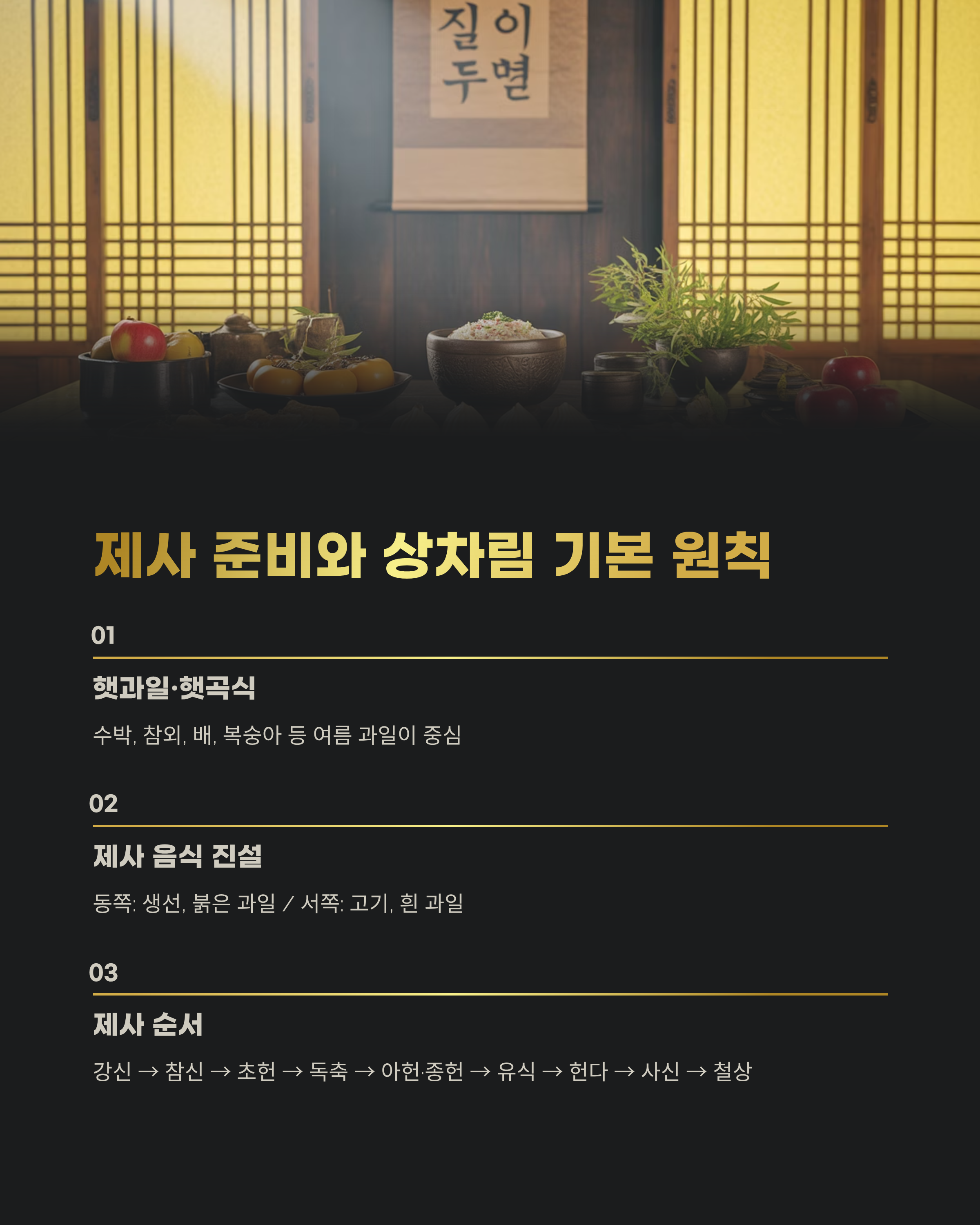 수박, 참외, 배, 복숭아 등 여름 과일이 중심입니다. - 제사 음식 진설 원칙