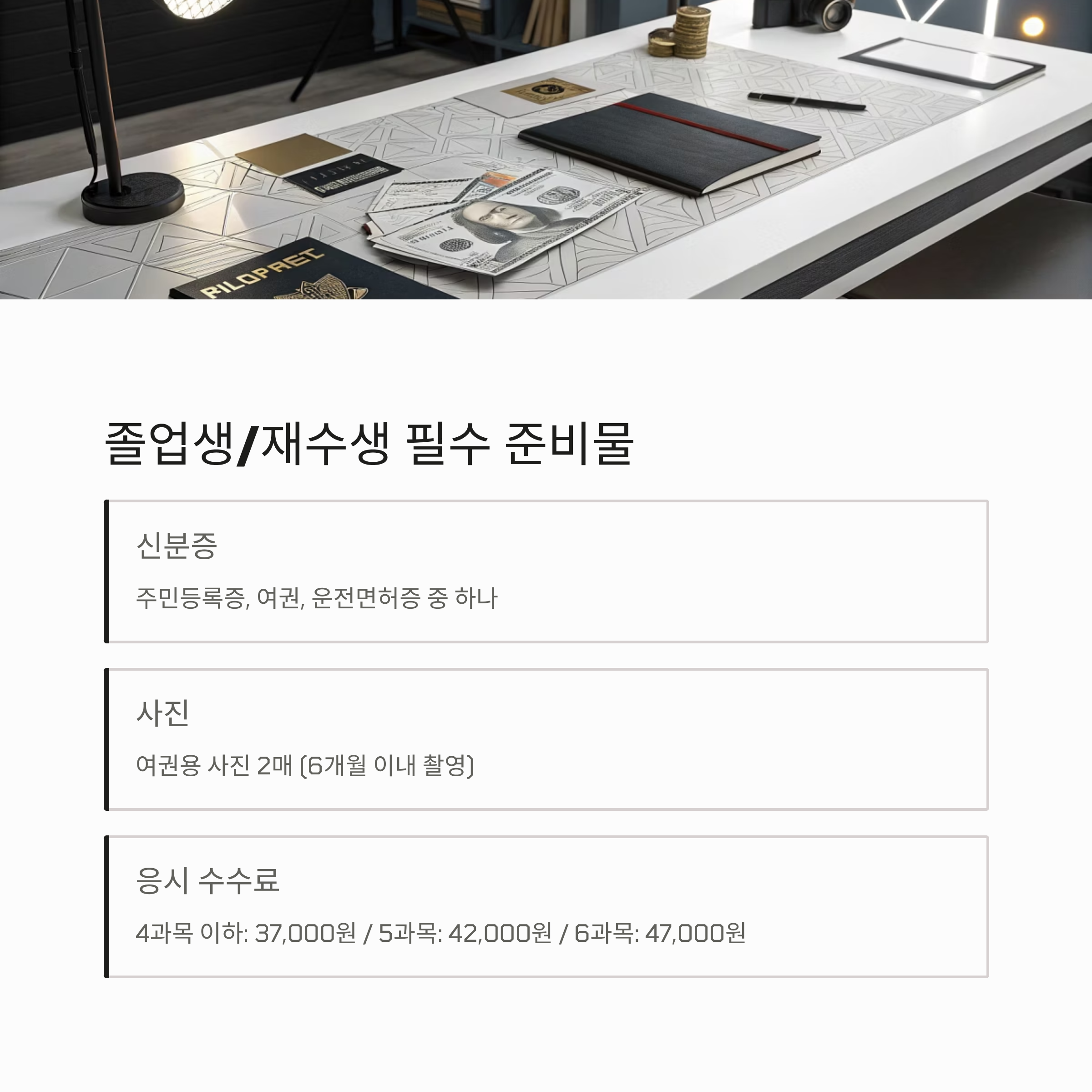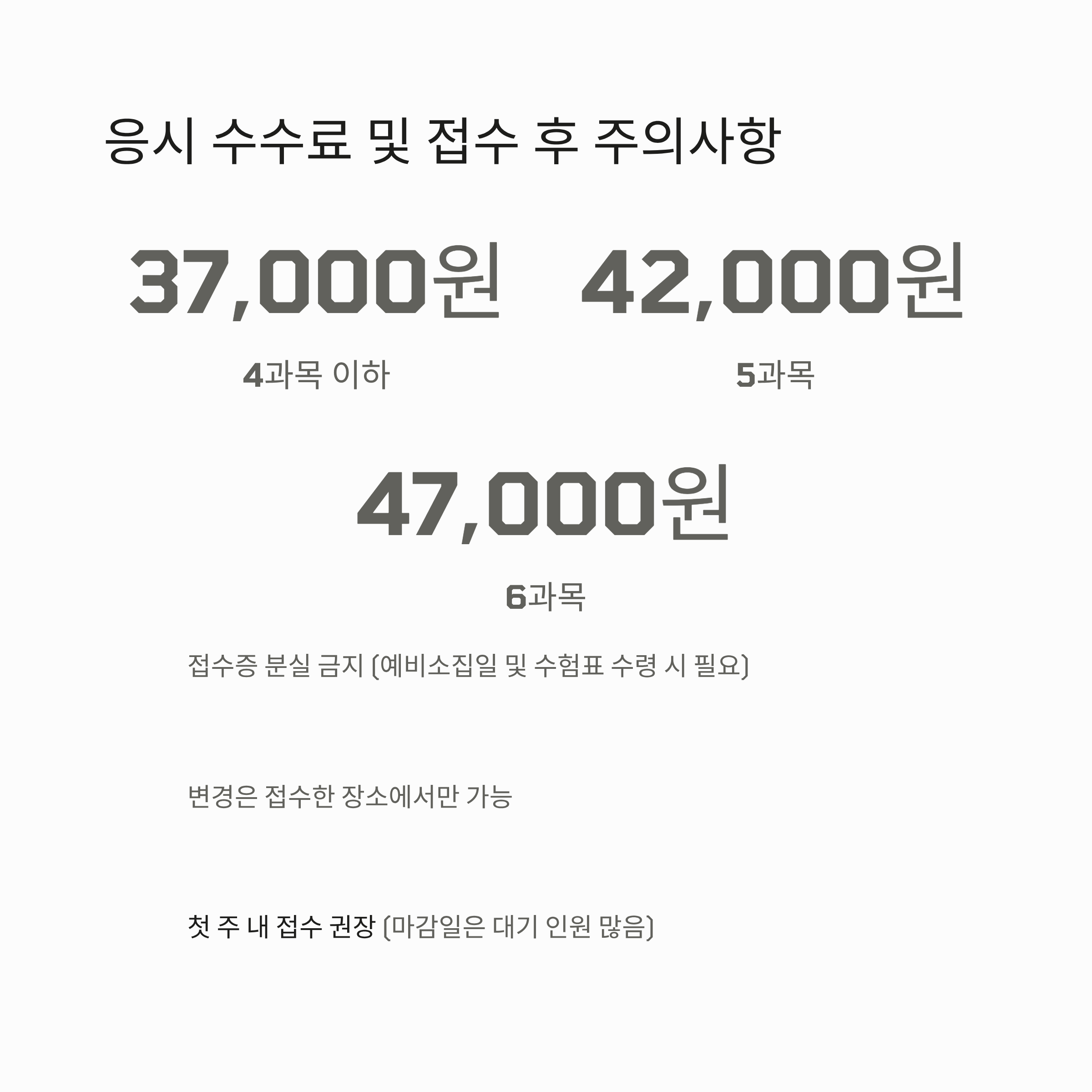응시 수수료 4과목 이하: 37,000원 / 5과목: 42,000원 / 6과목: 47,000원
