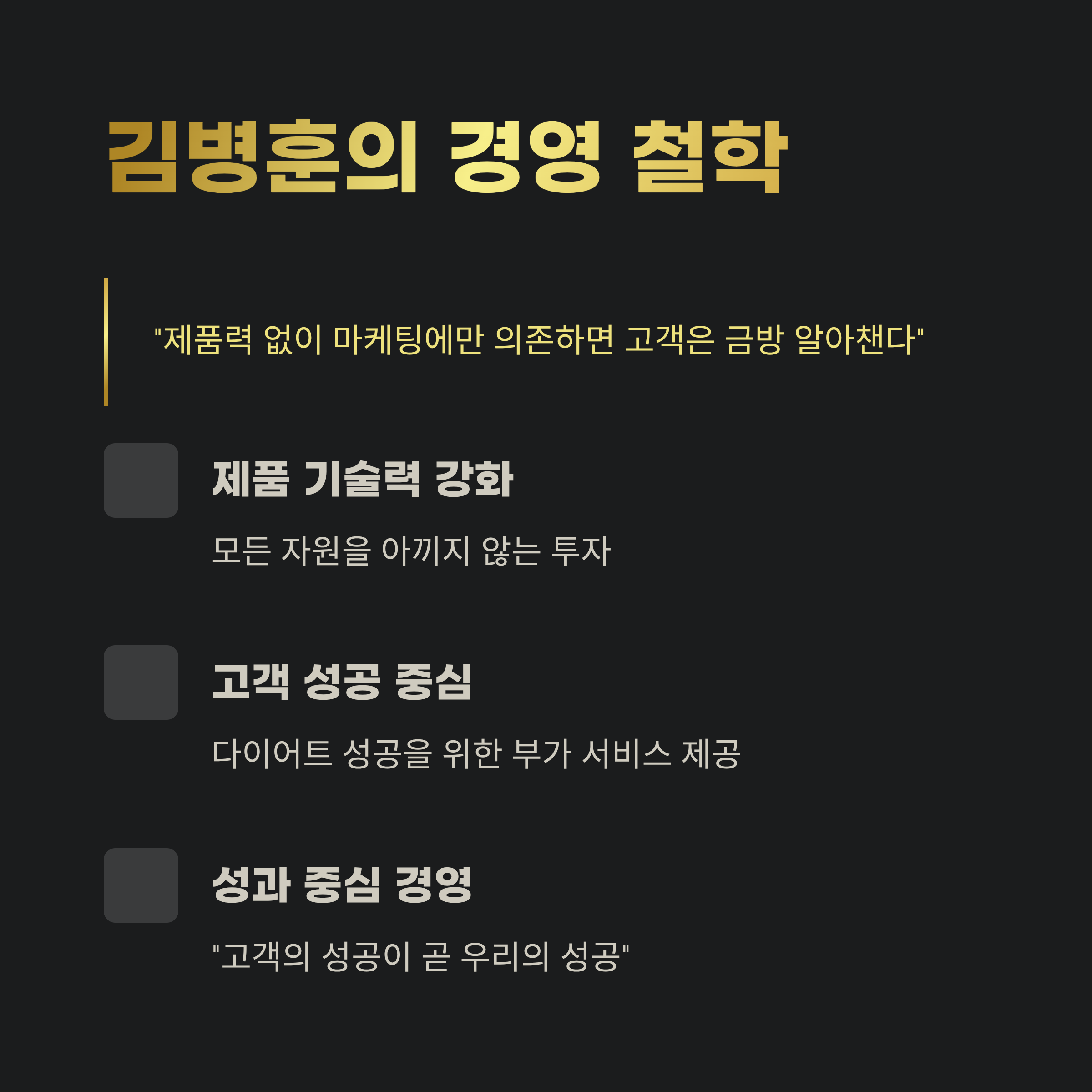 그는 "제품력 없이 마케팅에만 의존하면 고객은 금방 알아챈다"고 말합니다. 그래서 제품 기술력 강화에 모든 자원을 아끼지 않았습니다. 또한 건강기능식품 고객들에게는 다이어트 성공을 위한 부가 서비스도 제공하며 ‘성과 중심’ 경영을 실현했습니다.