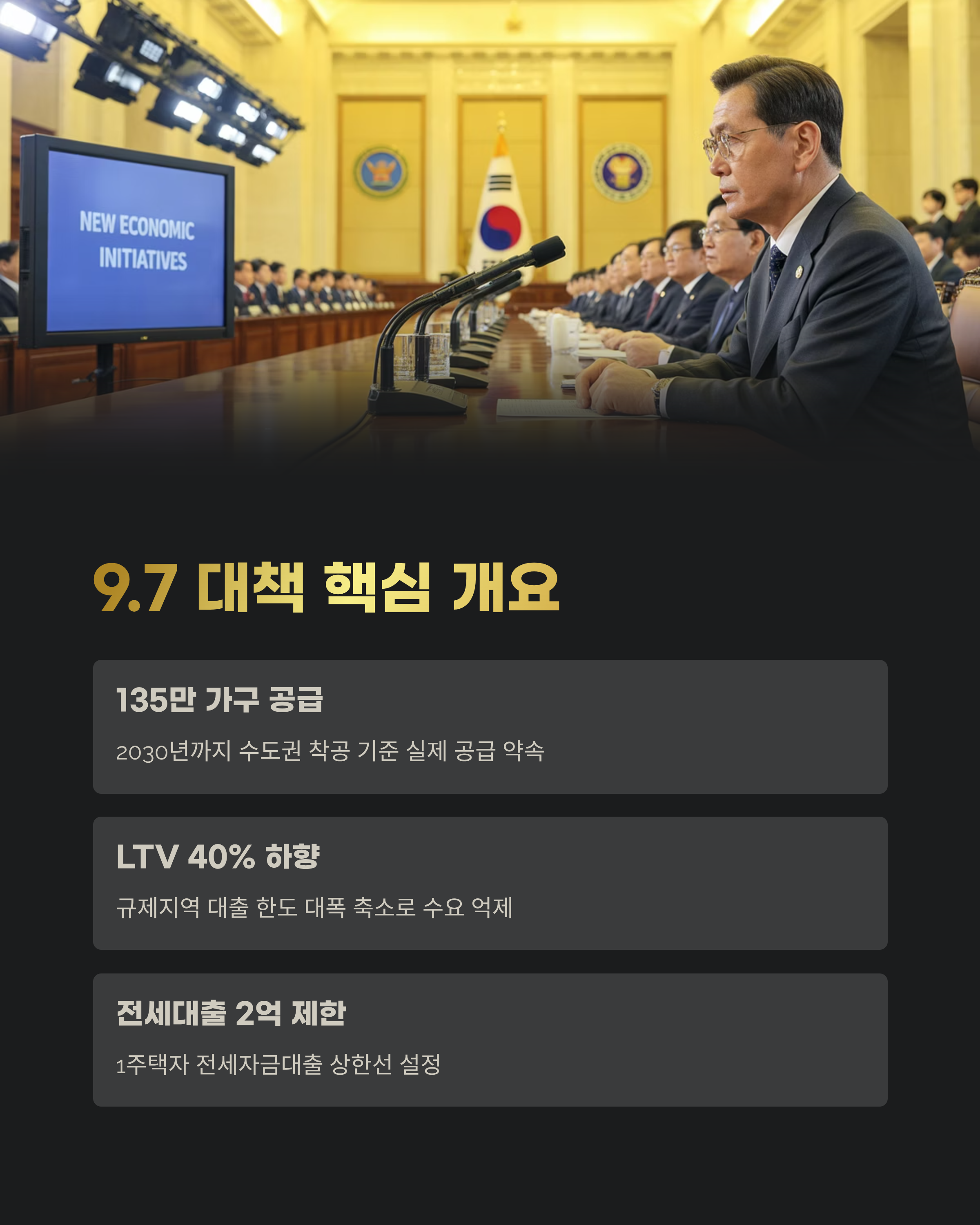 정부는 2025년 9월 7일, '9.7 부동산대책'을 발표하며 2030년까지 수도권에만 135만 가구를 착공하겠다는 계획을 내놓았습니다. 단순한 인허가가 아닌 실제 삽을 뜬 ‘착공’ 기준이라는 점에서 공급 실행력에 대한 기대감도 높아지고 있습니다. 동시에 LTV 40% 하향, 전세대출 2억 제한, 토지거래허가구역 지정 권한 확대 등 수요 억제책도 병행되어, 부동산 시장의 흐름에 큰 전환점을 예고하고 있습니다.