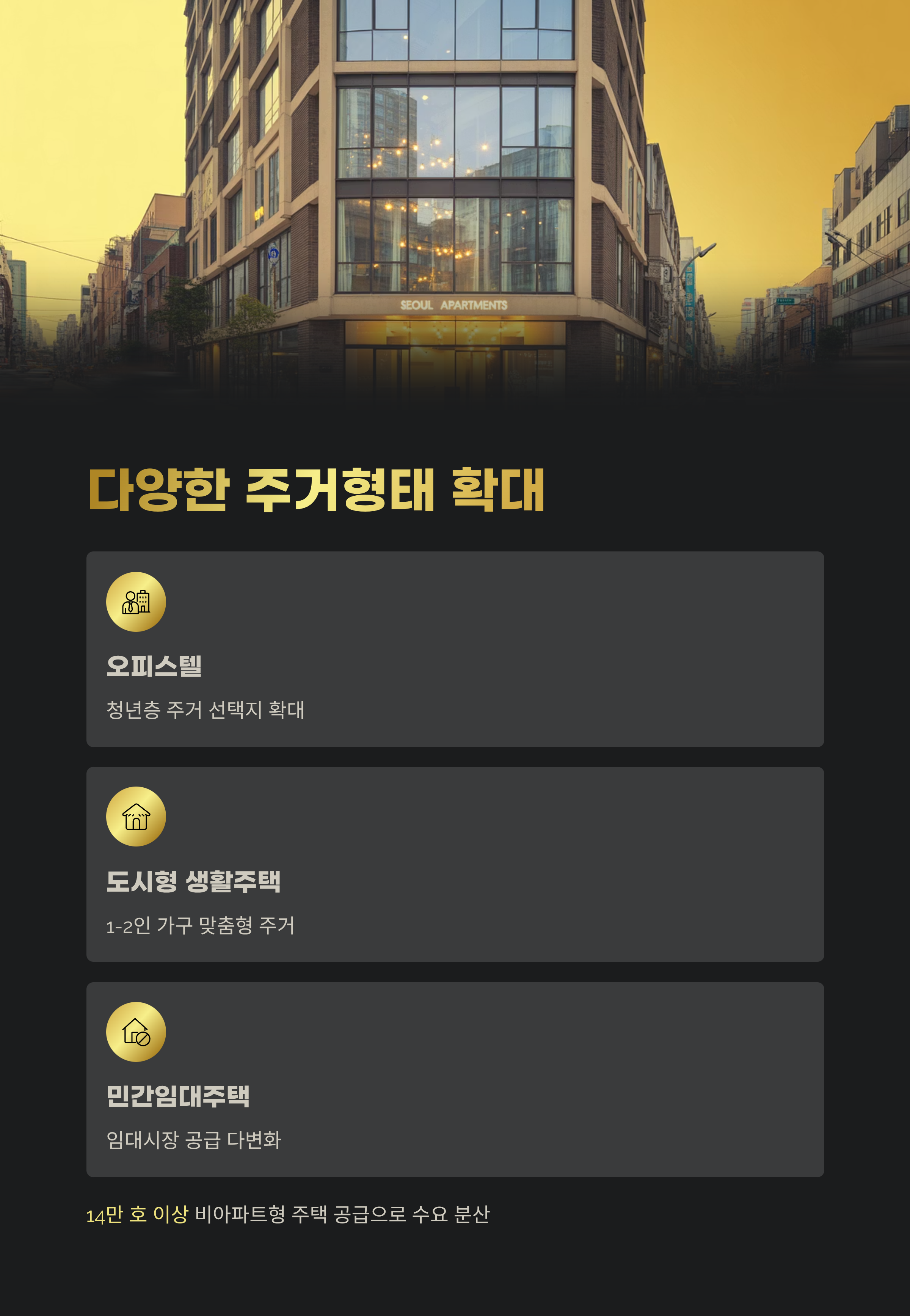 정부는 이번 대책에서 비(非)아파트형 주택 확대도 강조했습니다. 오피스텔, 도시형 생활주택, 민간임대주택 등 비전통적 주거 유형으로 14만 호 이상 공급한다는 계획입니다. 주택 유형의 다변화로 주거 수요를 분산하고, 청년층이나 1~2인 가구에게 다양한 선택지를 제공하겠다는 의도입니다.