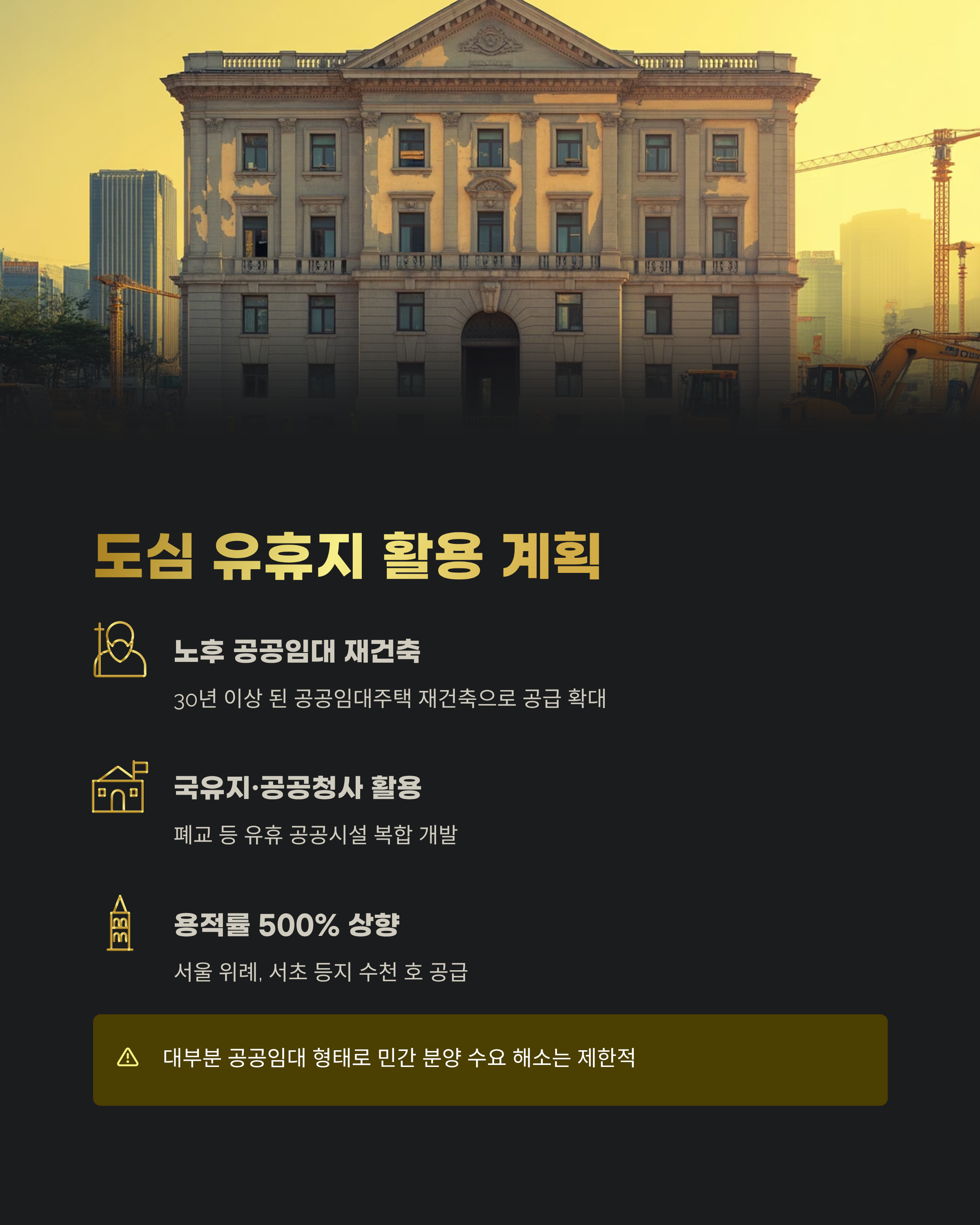 도시 내 30년 이상 노후 공공임대주택을 재건축하거나, 국유지·공공청사·폐교 등을 복합 개발해 입지 좋은 지역에서도 공급을 확대한다는 계획입니다. 용적률을 최대 500%까지 상향하고, 서울 위례, 서초 등지에서 수천 호 공급이 예고되어 있습니다.