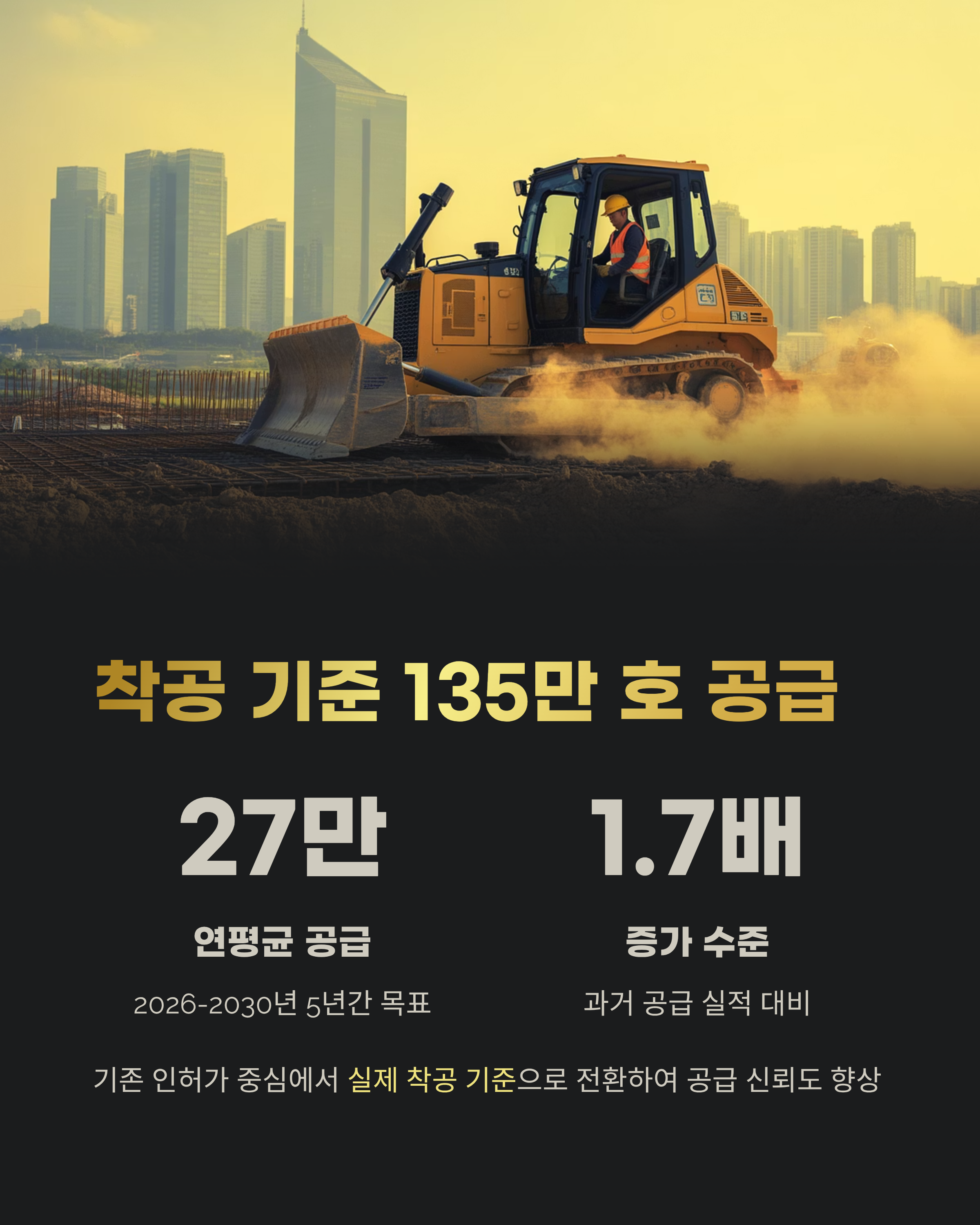 정부는 2026~2030년 5년간 연평균 27만 호, 수도권에만 총 135만 가구 공급을 약속했으며, 이는 과거 공급 실적의 1.7배 수준입니다.
