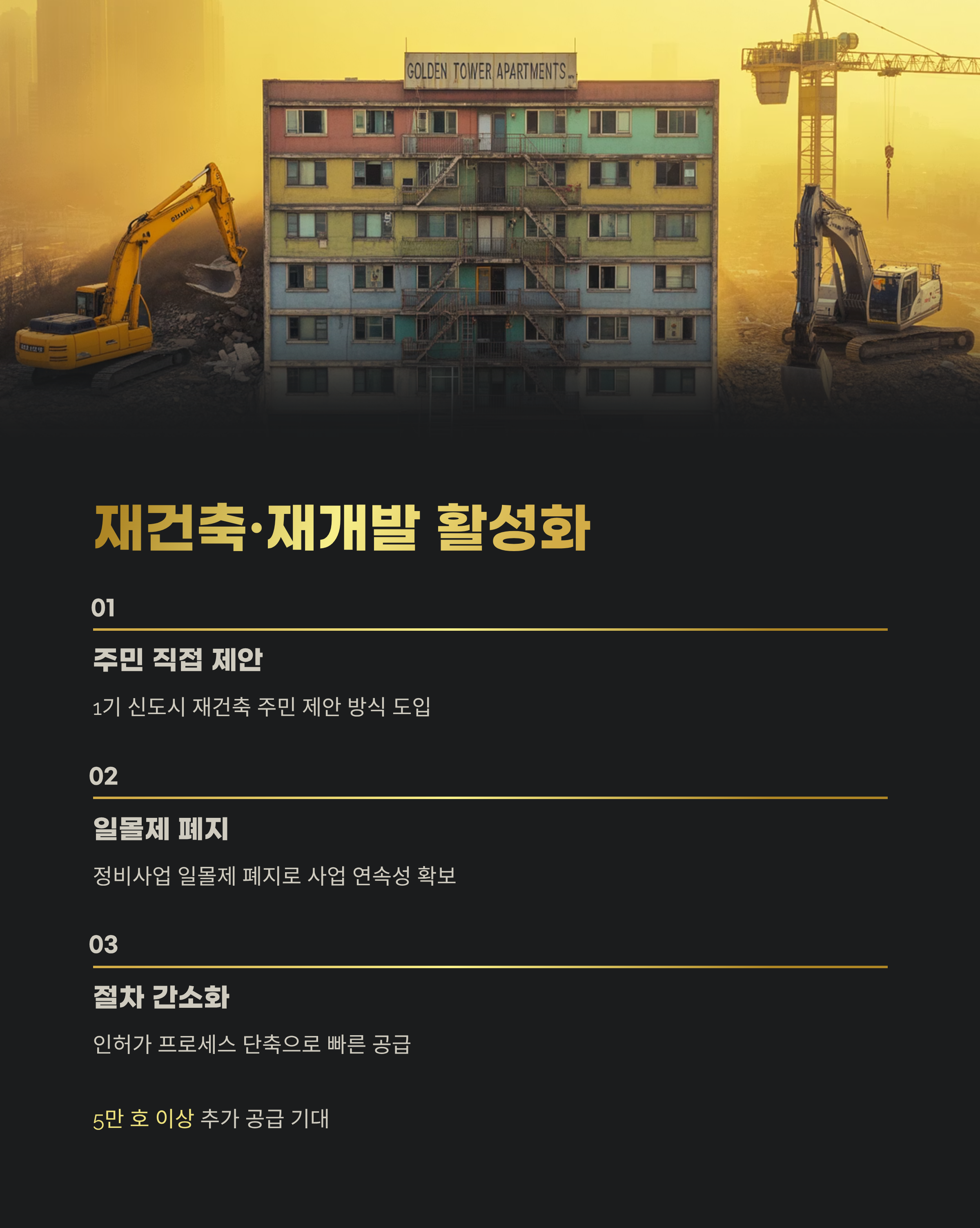 특히 재개발·재건축 절차가 길고 복잡해 지연되던 문제를 해결하고자, 각종 행정 프로세스를 간단히 하여 빠른 공급이 가능하도록 했습니다.